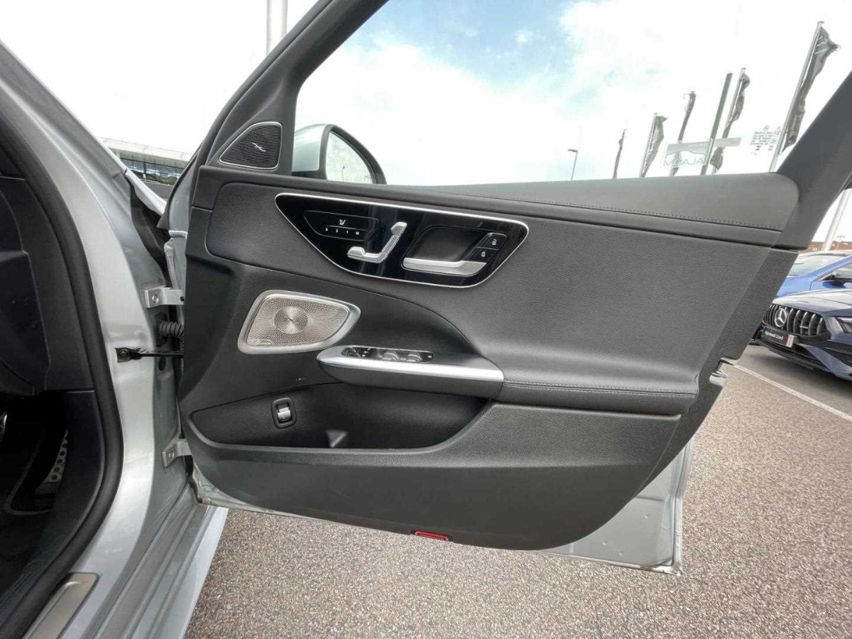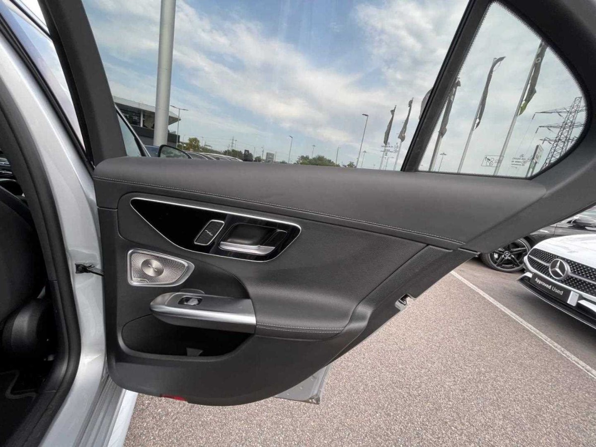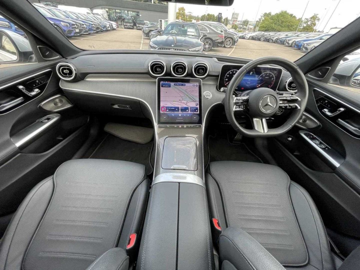 The Mercedes-Benz C Class offers a stylish interior with advanced technology, including a digital instrument cluster, head-up display, and MBUX navigation system. Enhanced driver comfort is provided by heated, electrically adjustable seating with memory functionality and dual-zone climate control. Exterior highlights include 19-inch AMG alloy wheels, AMG body styling, and LED lighting throughout.