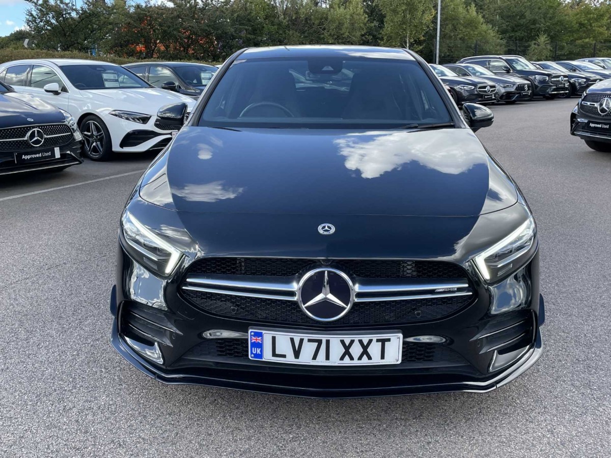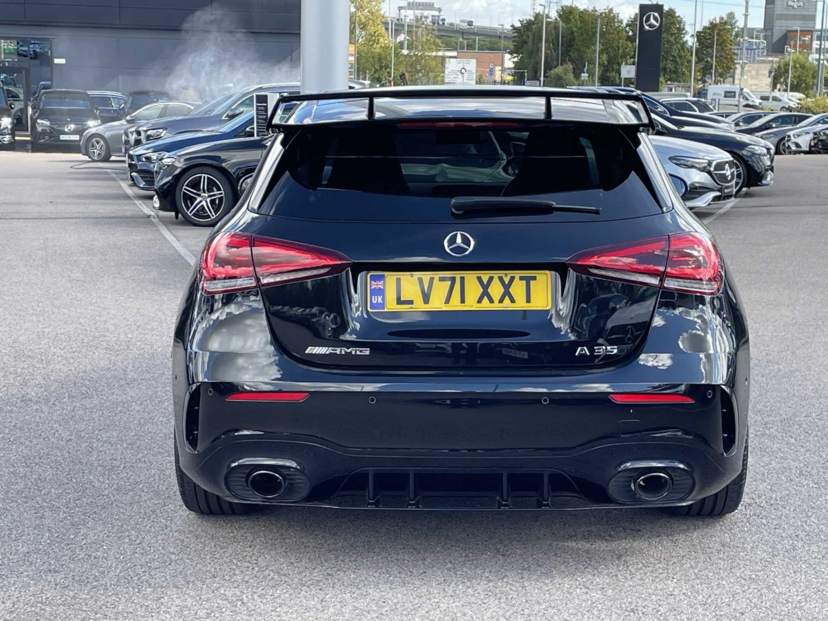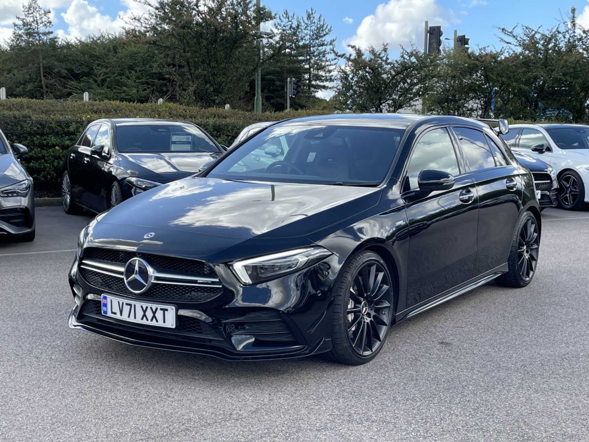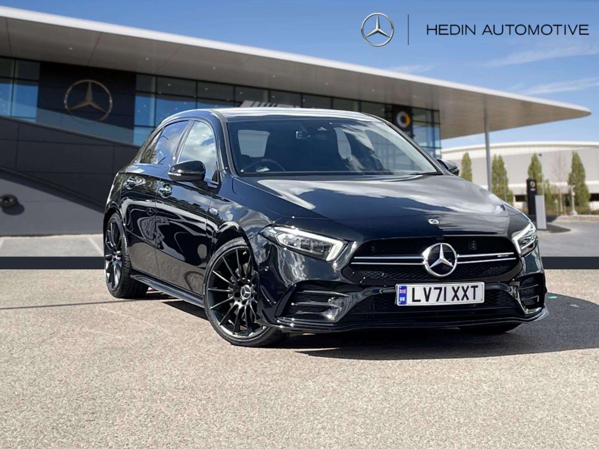 This is a 2021 Mercedes-Benz A Class A35 4Matic Premium Plus Edition 5dr Auto in Cosmos black metallic. The vehicle is a used model with 4,552 miles on the odometer.