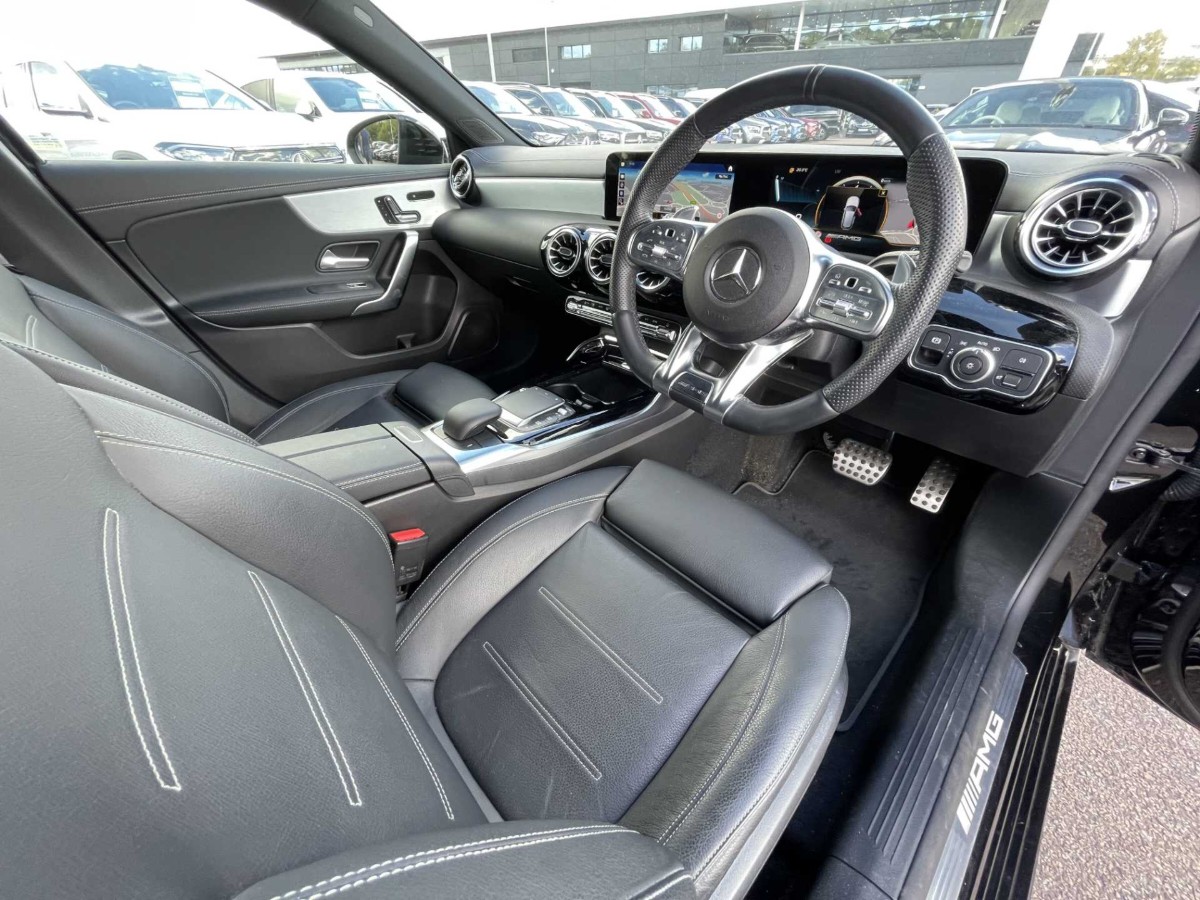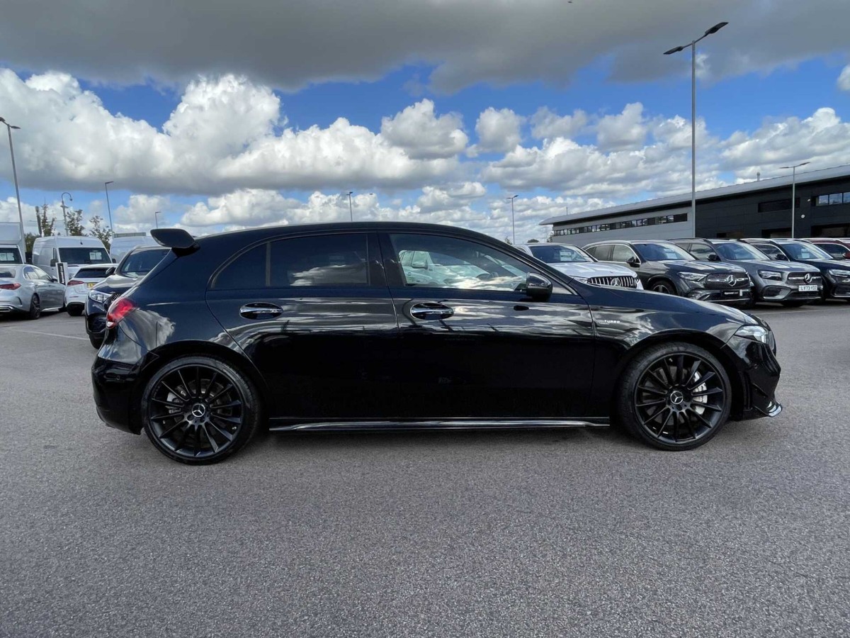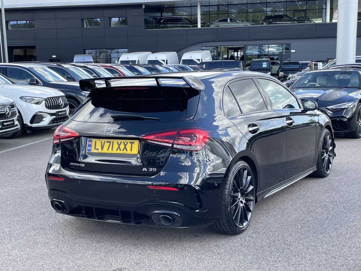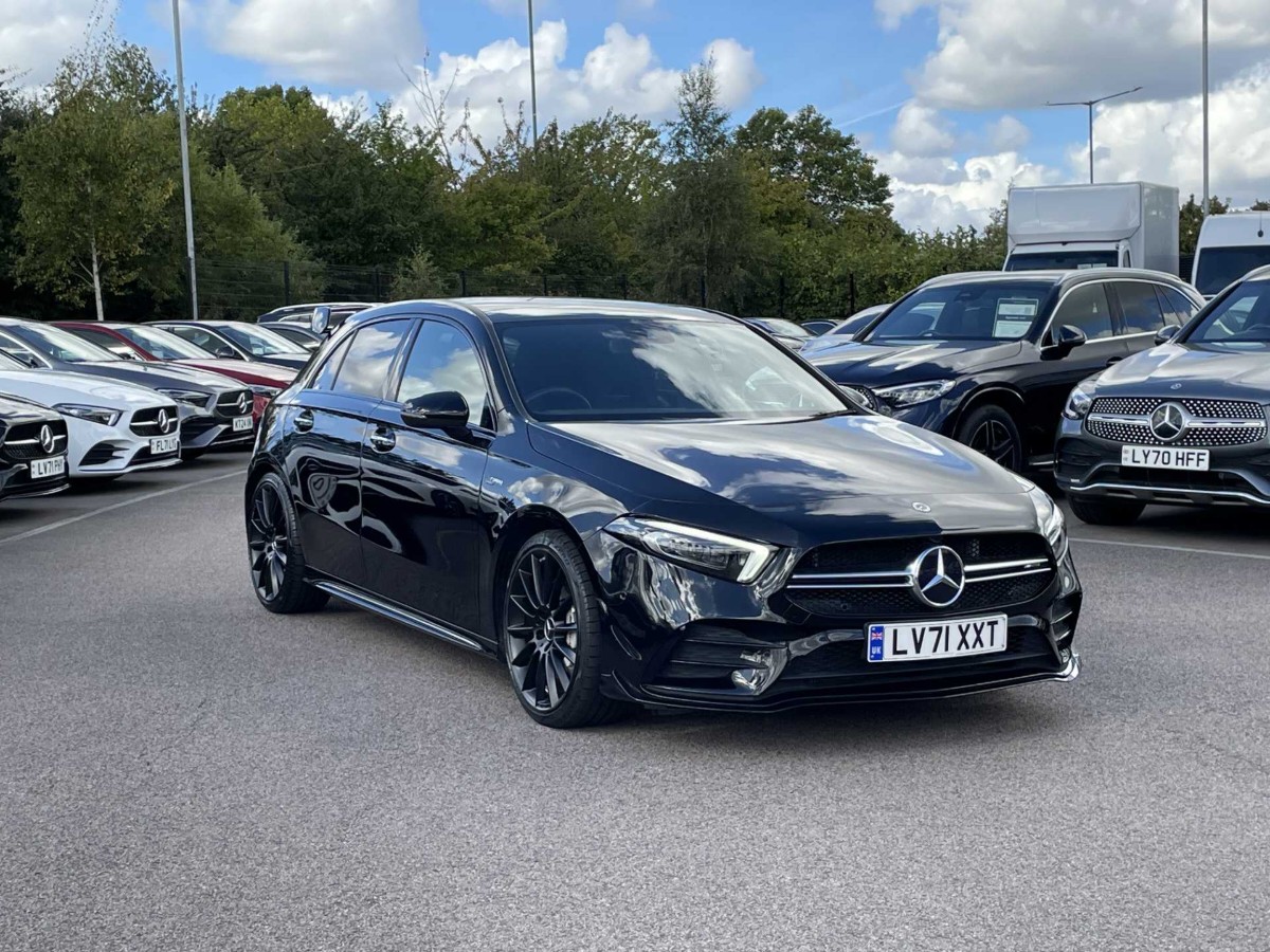 This is a 2021 Mercedes-Benz A Class A35 4Matic Premium Plus Edition 5dr Auto in Cosmos black metallic. The vehicle is a used model with 4,552 miles on the odometer.
