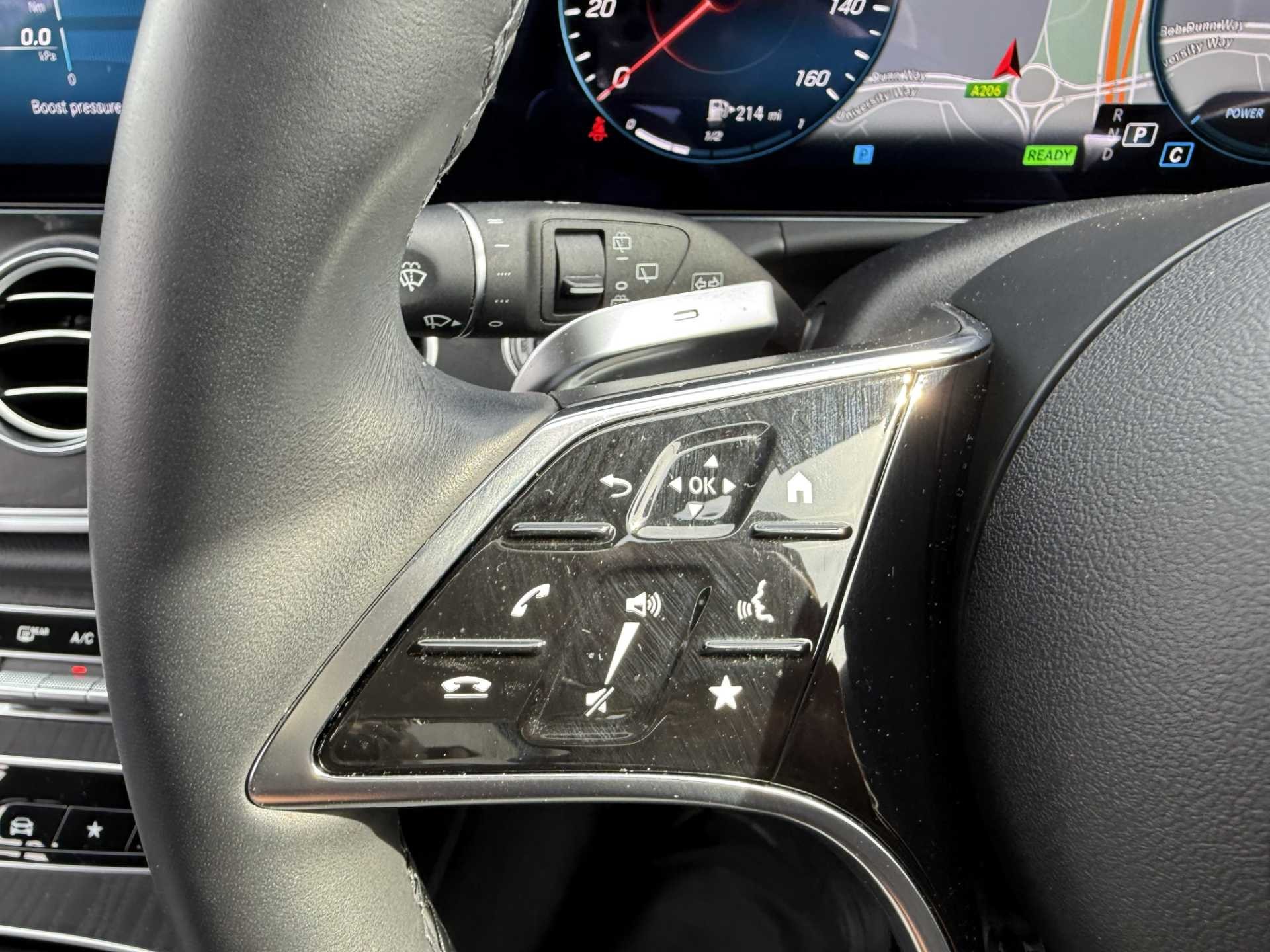 - 3 spoke multifunction flat bottom AMG steering wheel with chrome inserts and touch control buttons, trimmed in black nappa leather