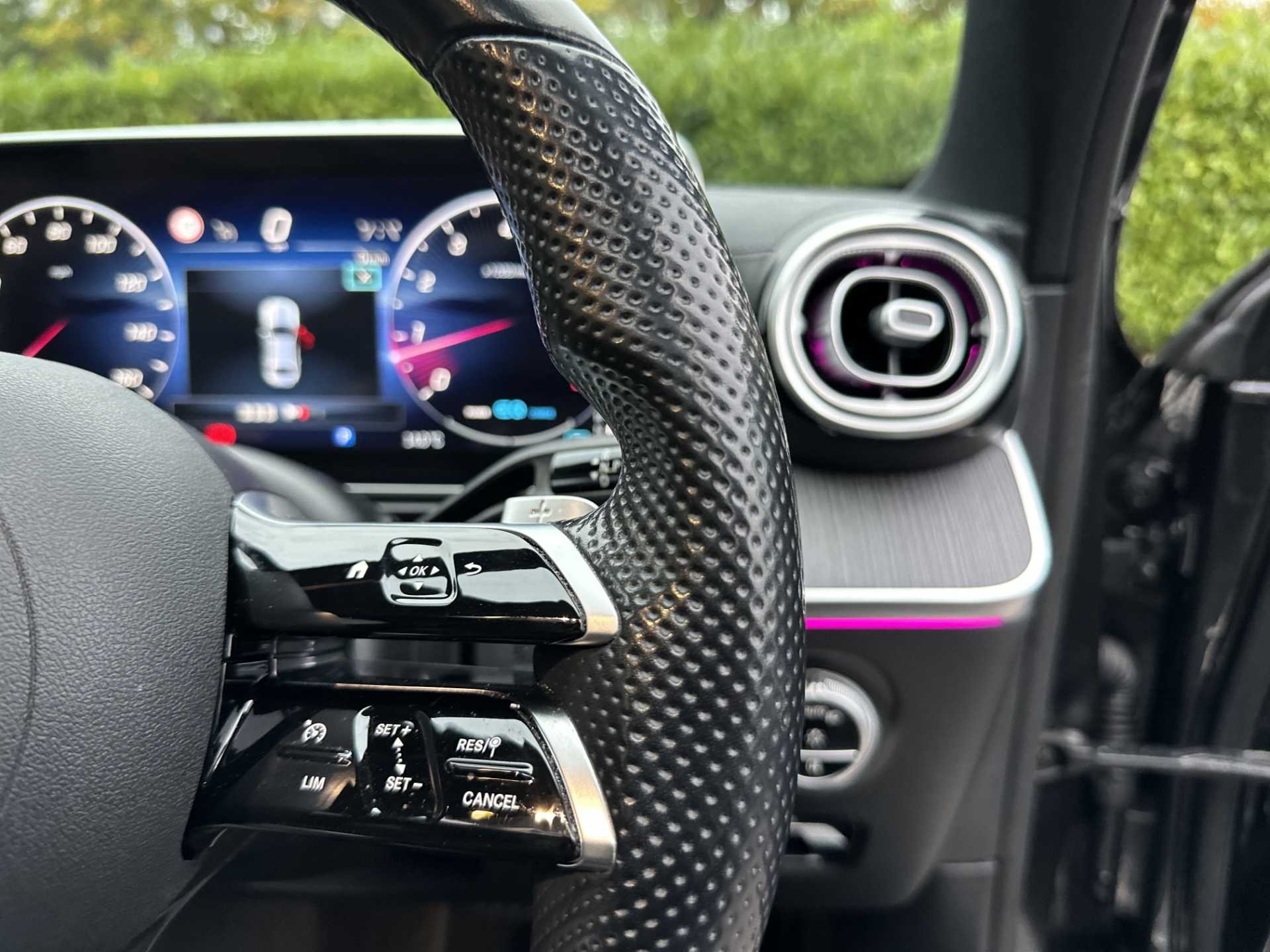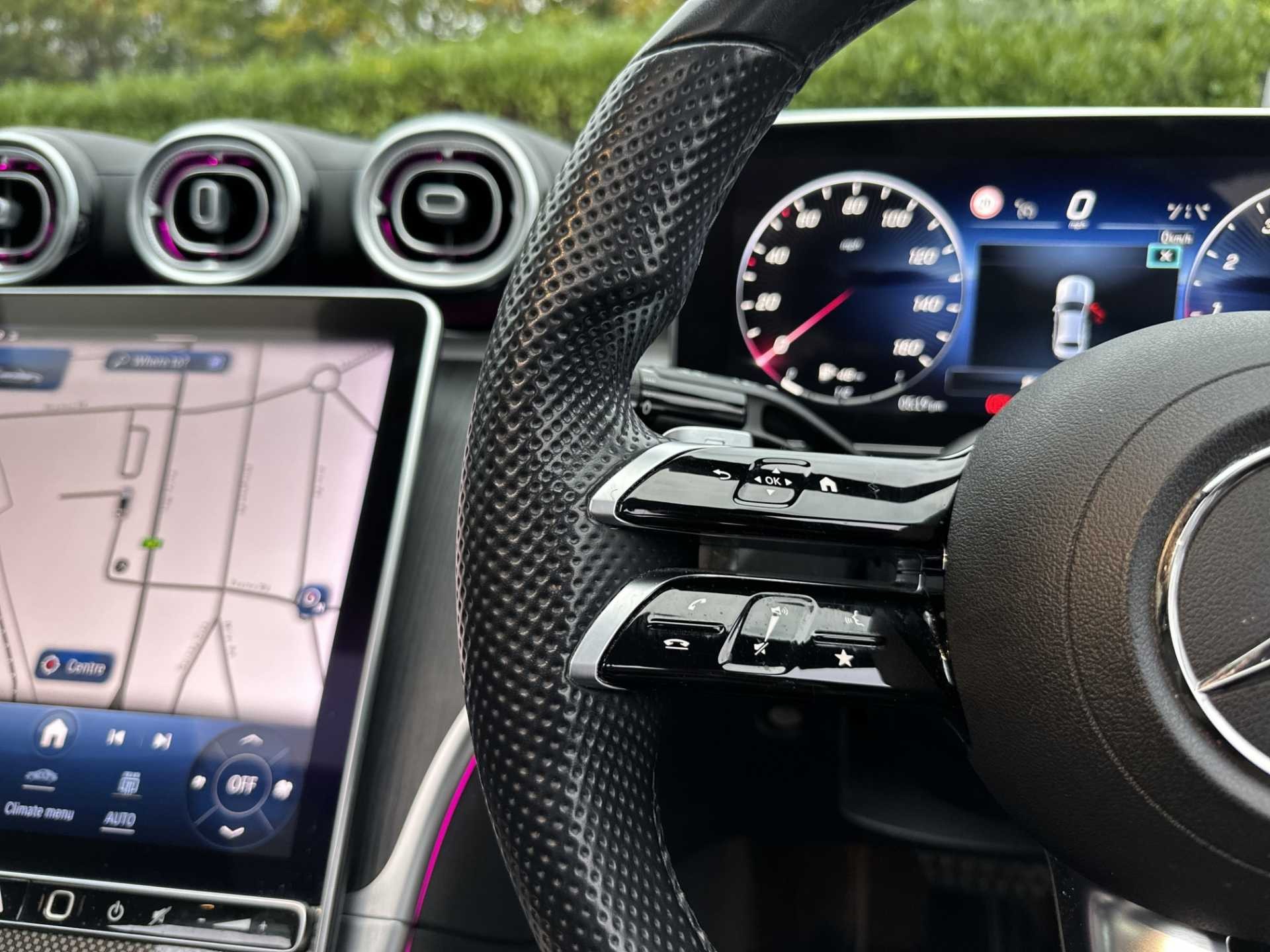 - 3 spoke flattened bottom AMG multifunction steering wheel in black nappa leather with chrome inserts and perforated leather in grip area