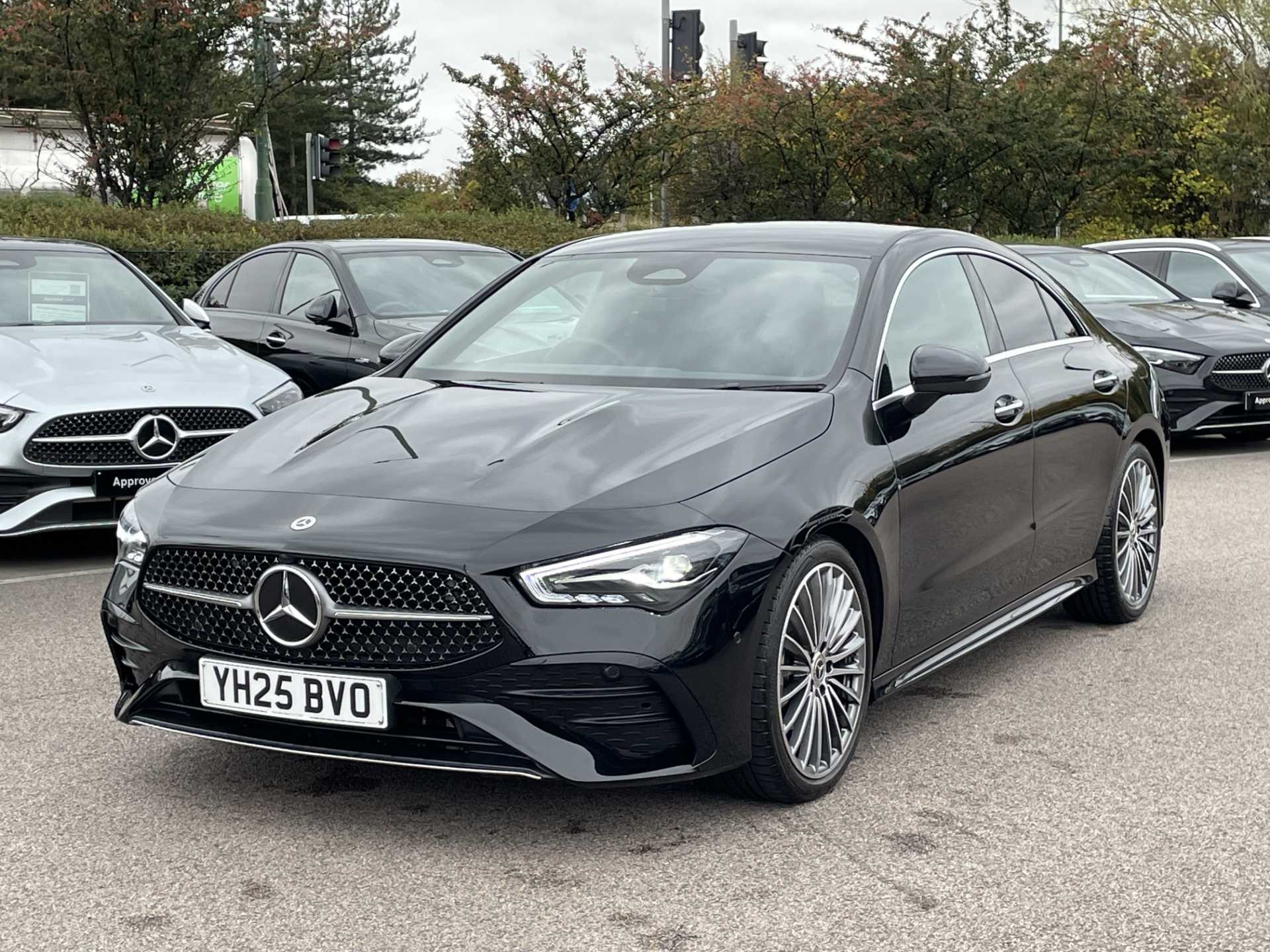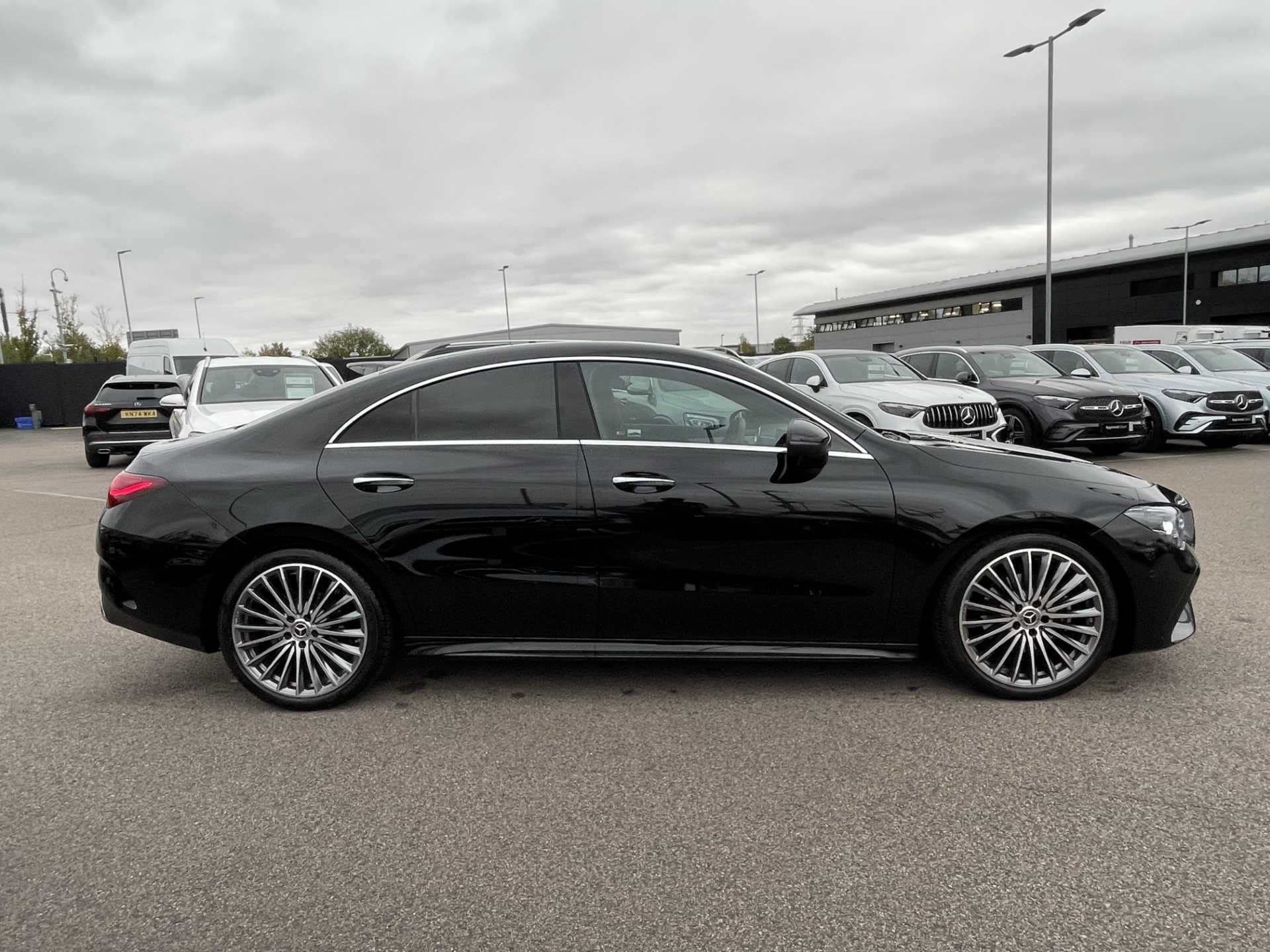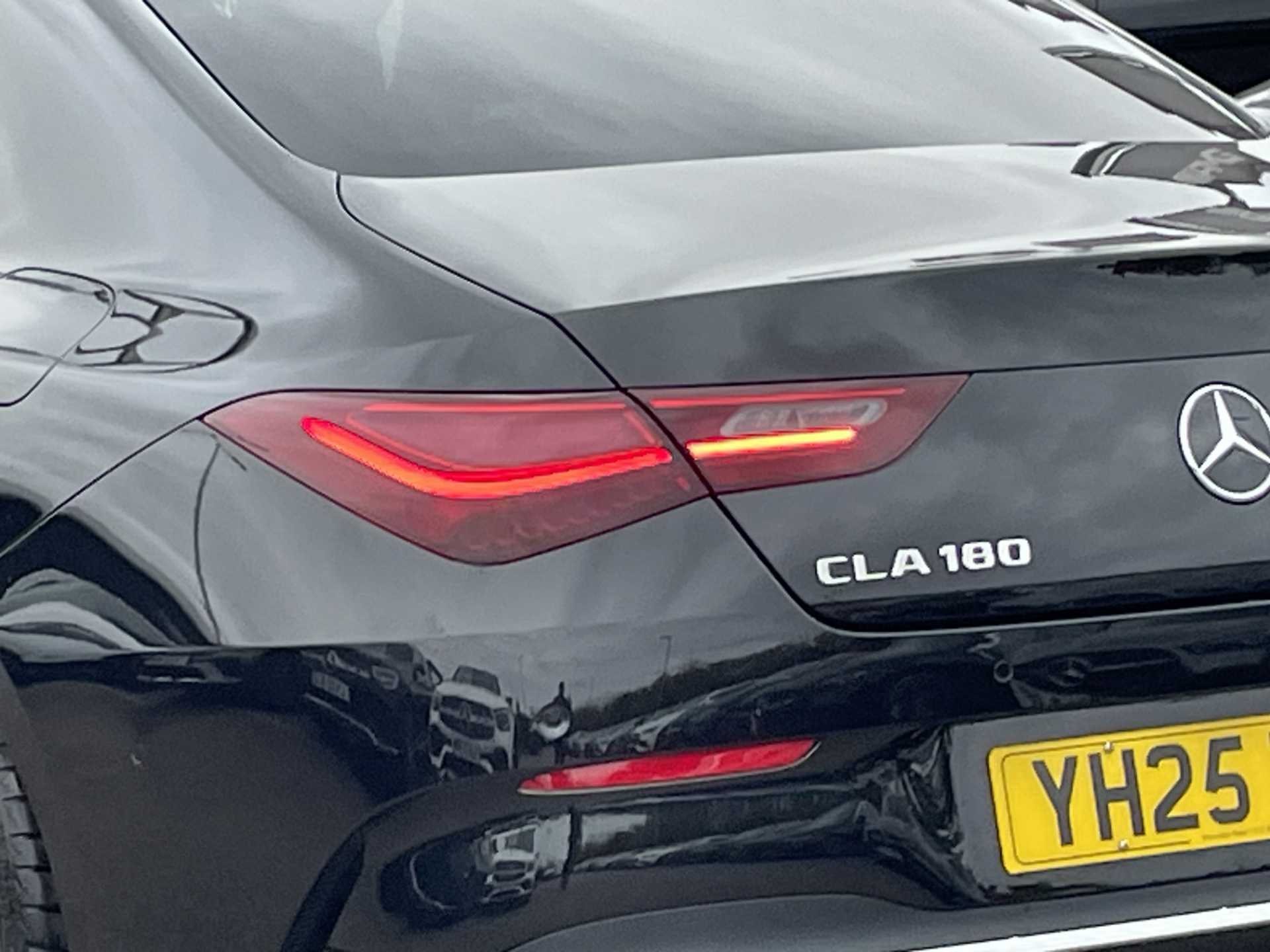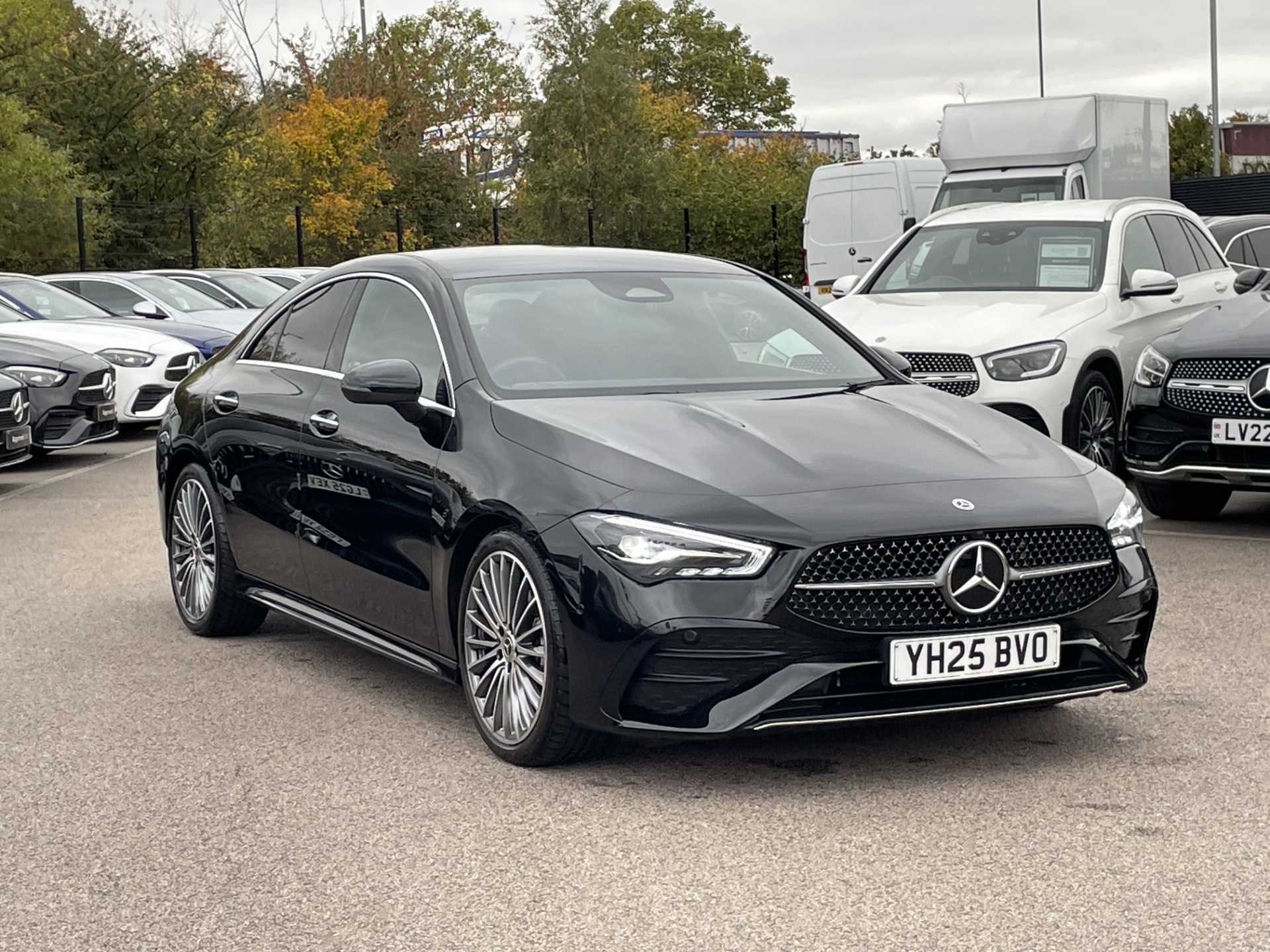 This listing is for a used 2025 Mercedes-Benz CLA Coupe finished in Cosmos Black. The vehicle features an automatic transmission and an interior with ARTICO man-made leather and DINAMICA microfibre upholstery. It is classified as a personal car and has a CO2 emission rating of 143 g/km (based on WLTP standards).