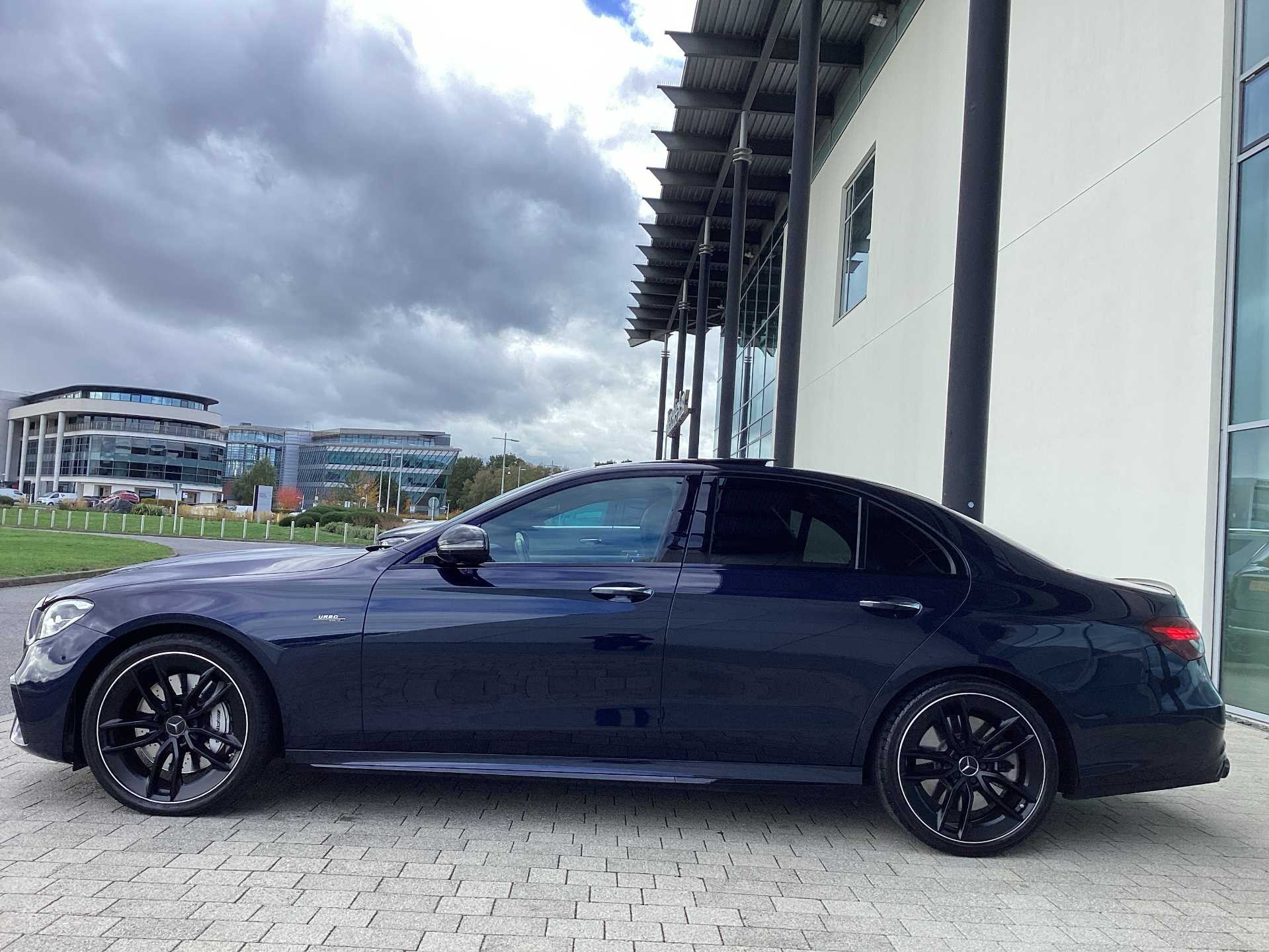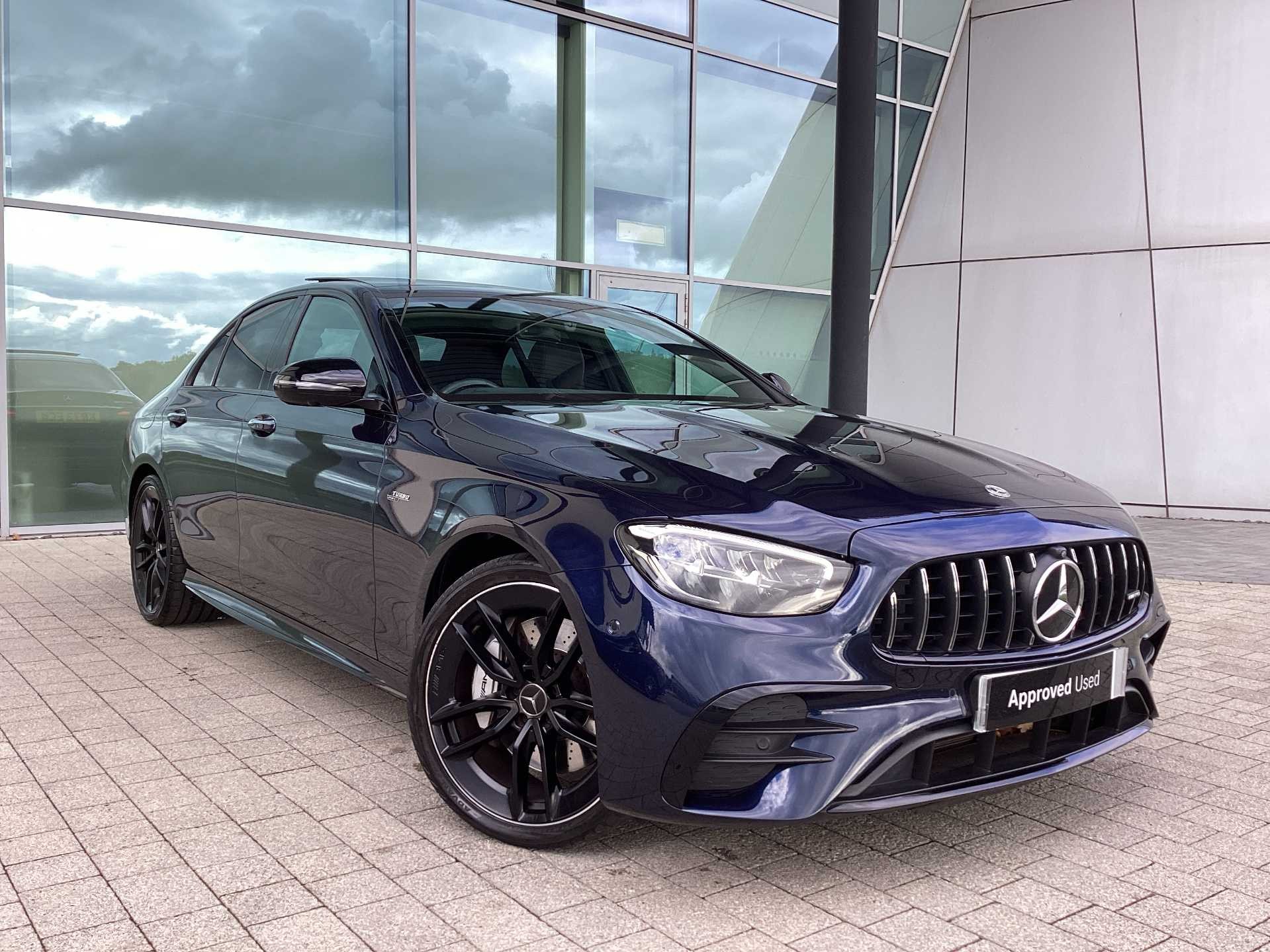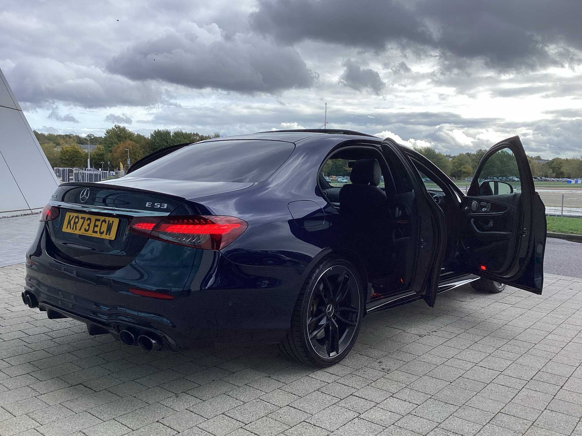 This is a used 2023 Mercedes Benz AMG E 53 4MATIC+ Night Edition Premium Plus with an automatic transmission and hybrid fuel type. The car features a saloon body style and is finished in a blue exterior colour. It offers a premium interior with Nappa leather in black and accommodates up to five passengers.