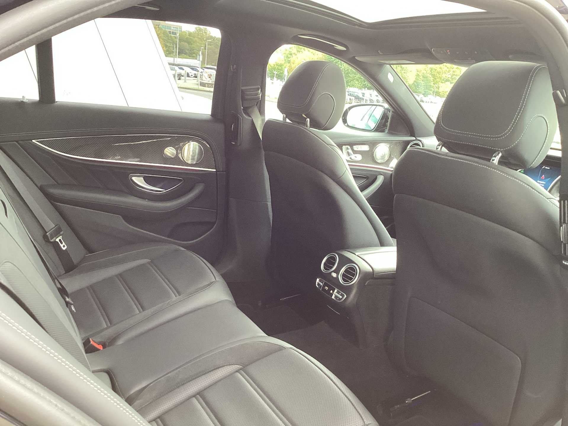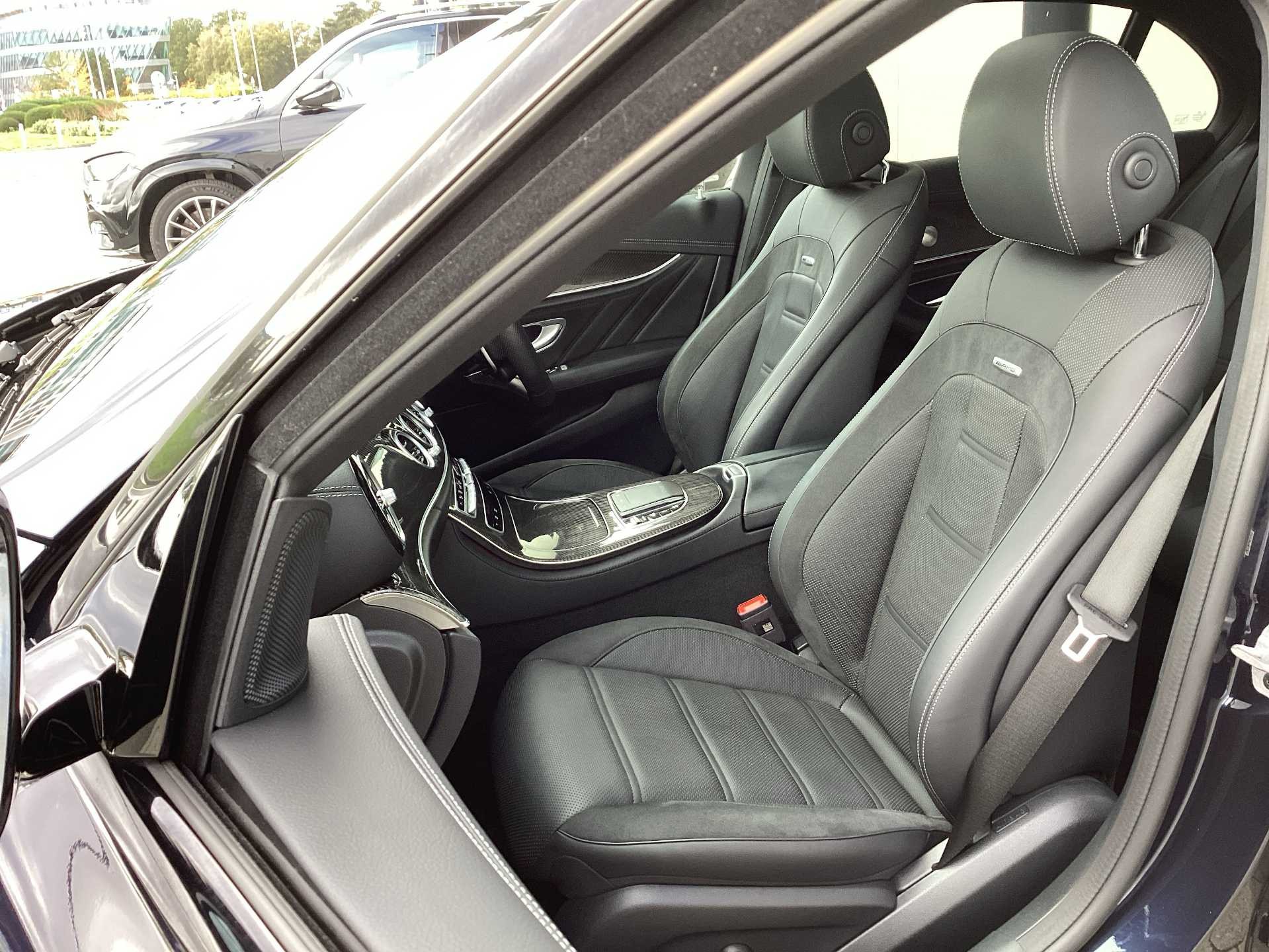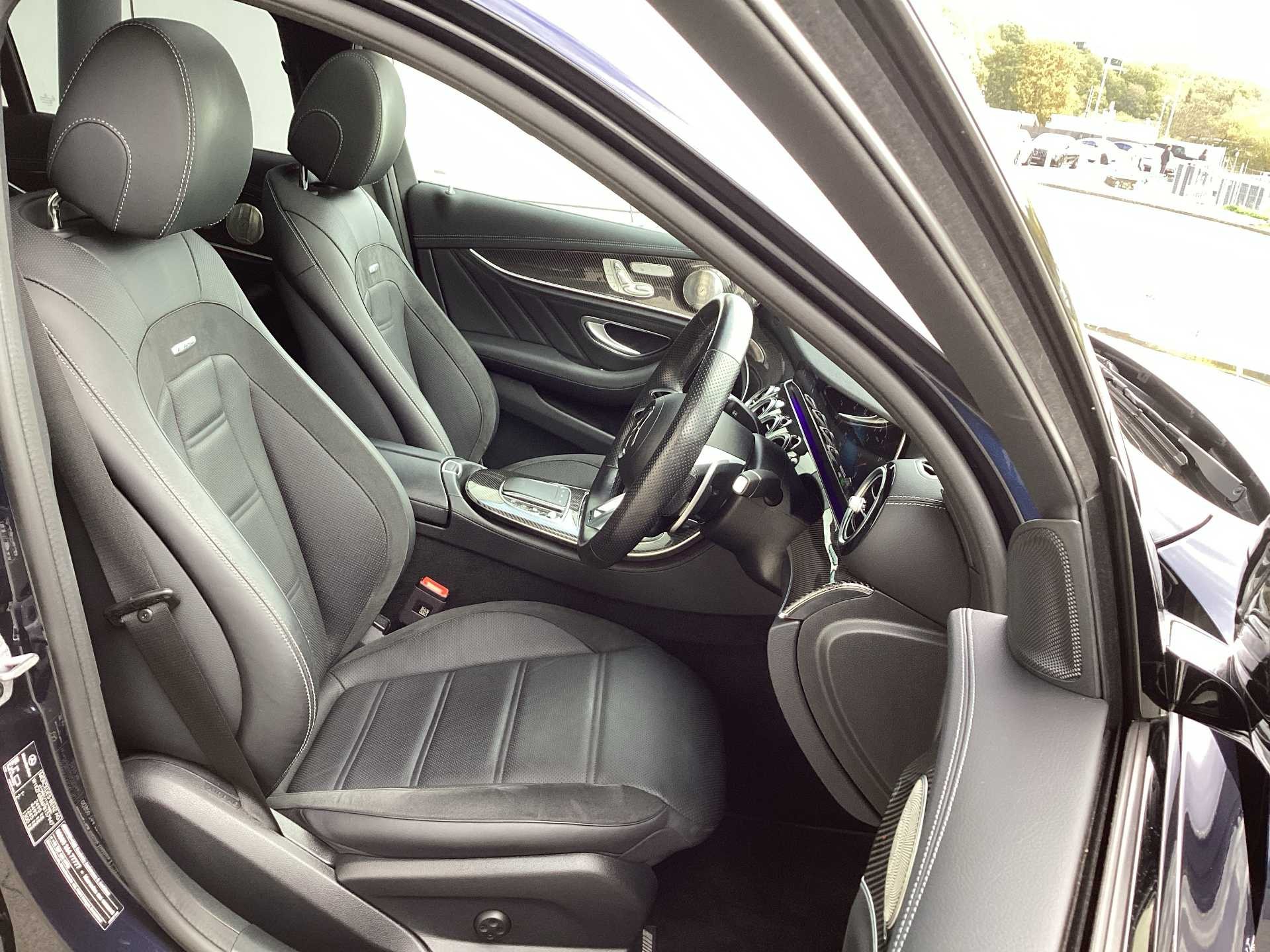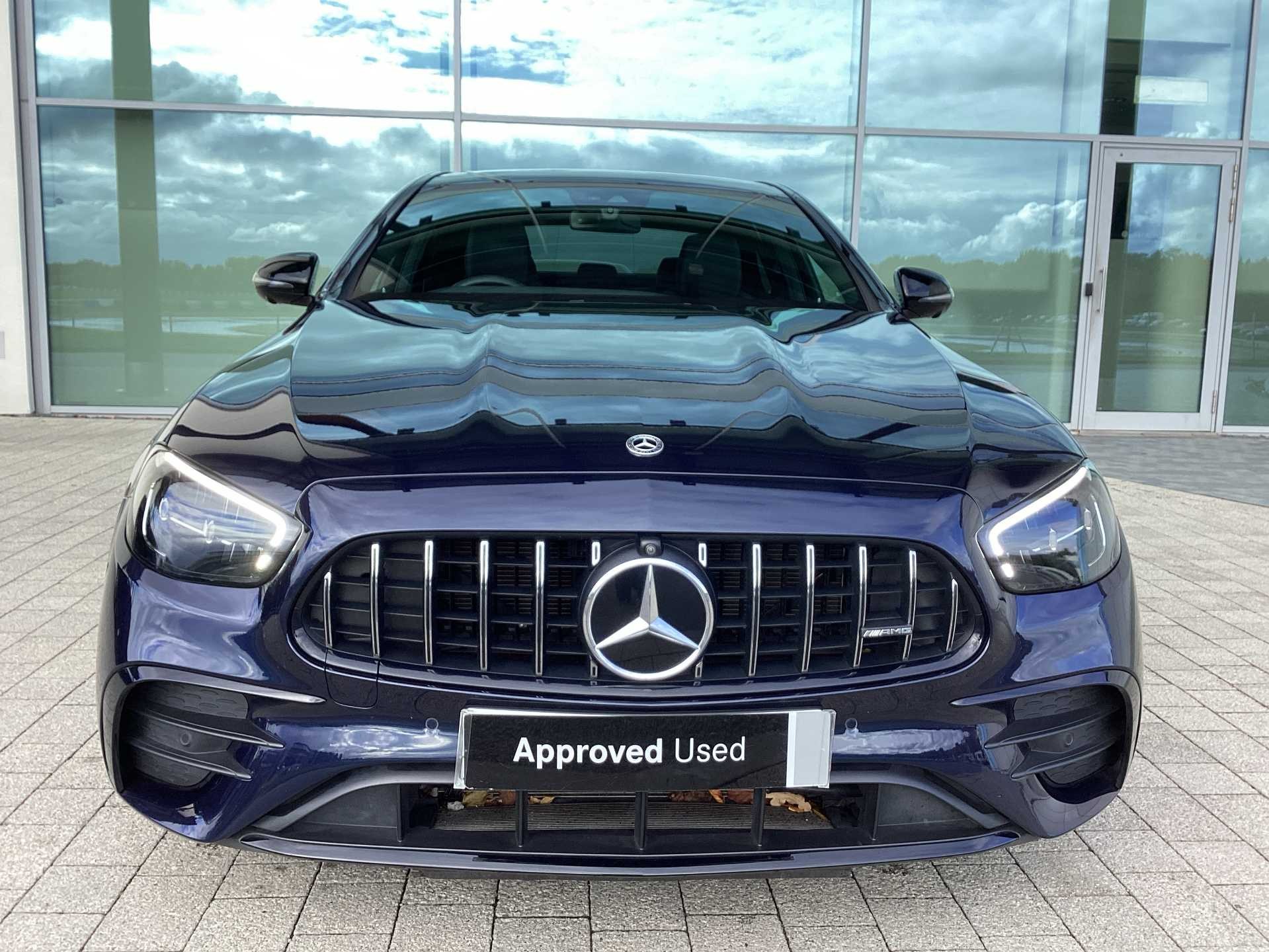 This is a used 2023 Mercedes Benz AMG E 53 4MATIC+ Night Edition Premium Plus with an automatic transmission and hybrid fuel type. The car features a saloon body style and is finished in a blue exterior colour. It offers a premium interior with Nappa leather in black and accommodates up to five passengers.