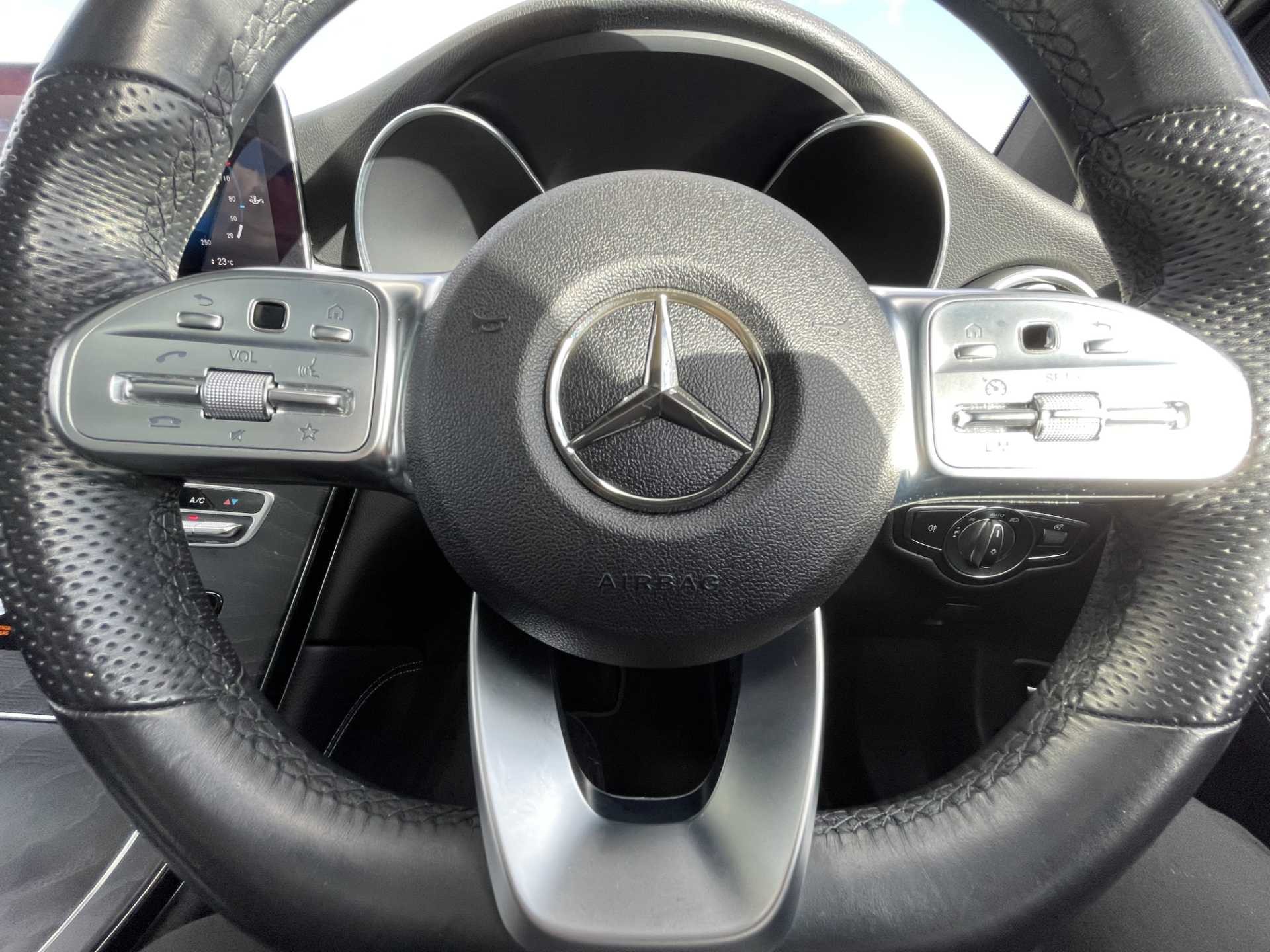 - 3-spoke multifunction sport AMG steering wheel in black nappa leather with flattened bottom section, chrome insert and perforated leather in grip area