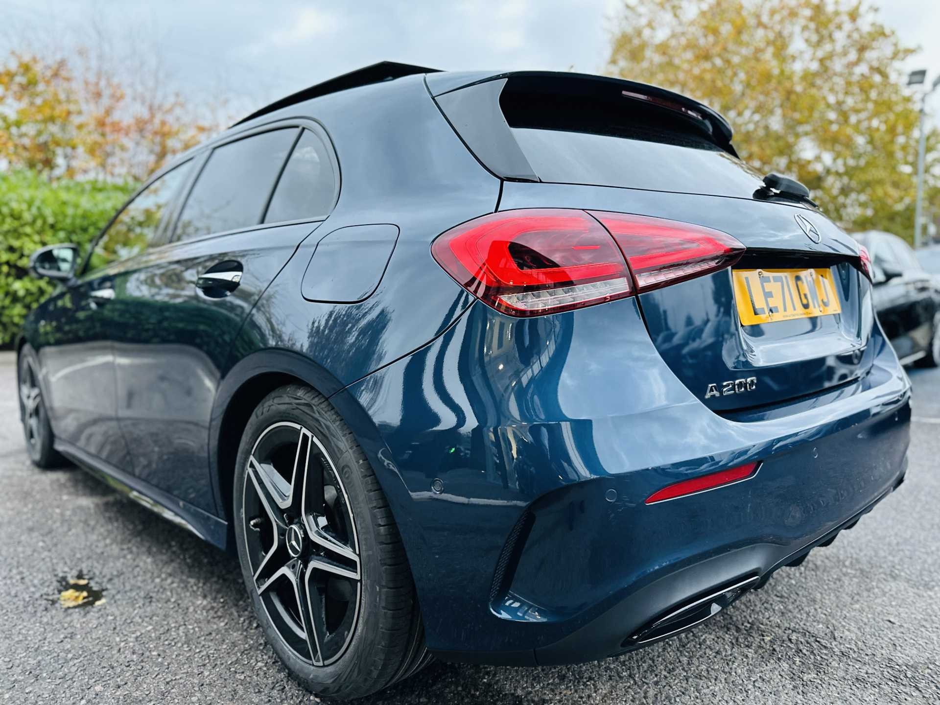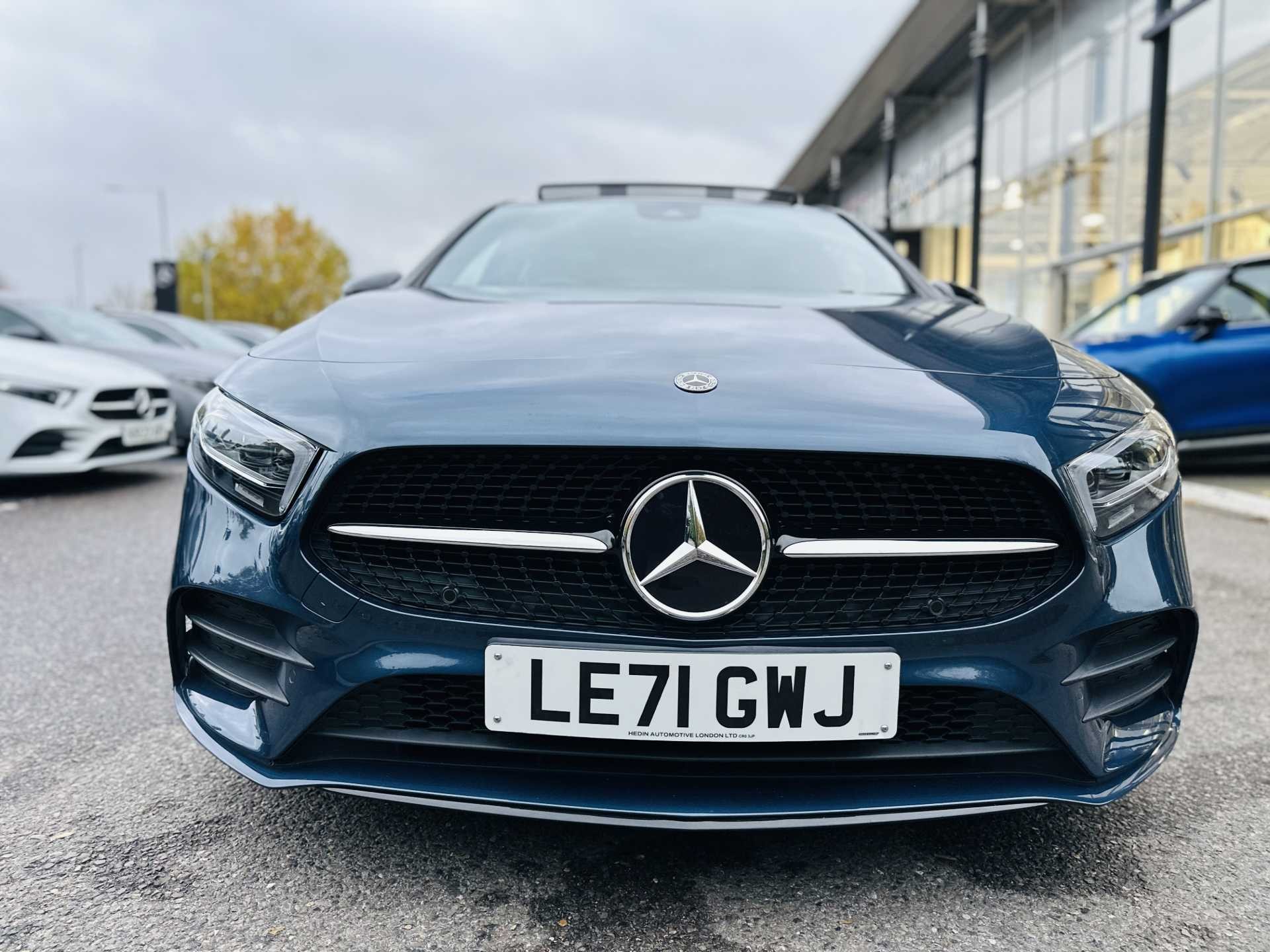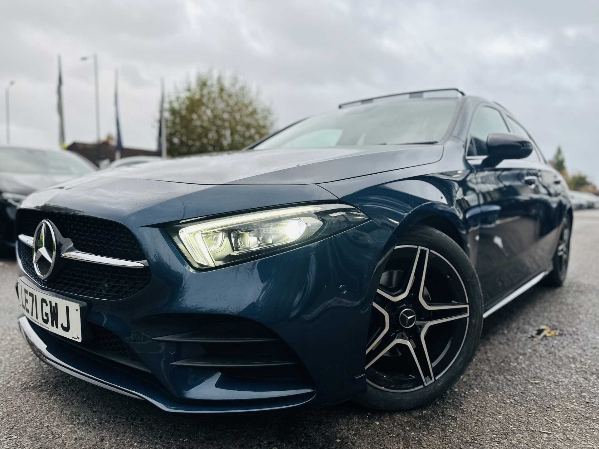 This is a 2022 Mercedes-Benz A-Class A200 AMG Line Premium Plus Edition 5dr Auto. The car comes in a sophisticated Denim Blue Metallic finish and has a 5-door hatchback design.