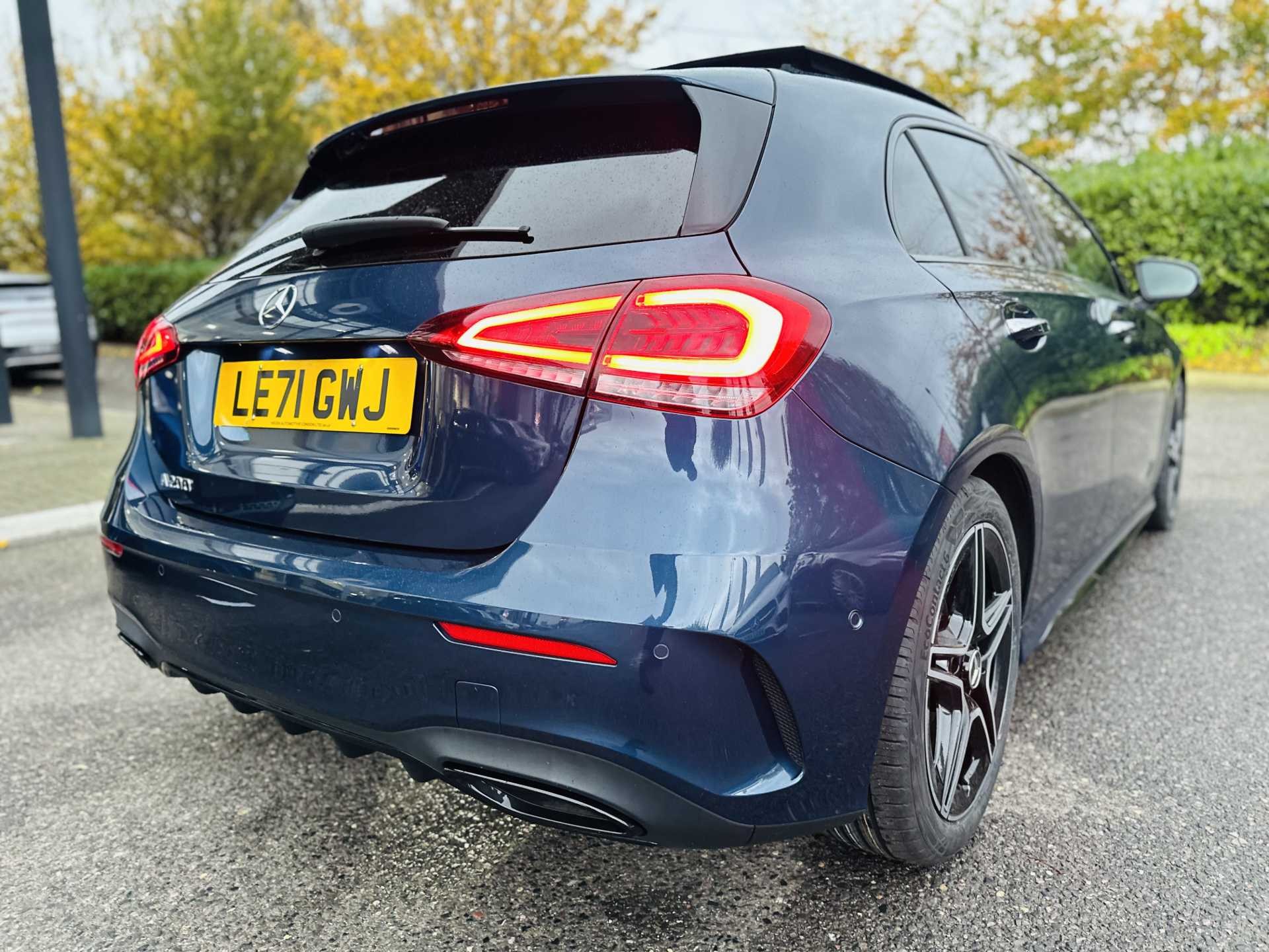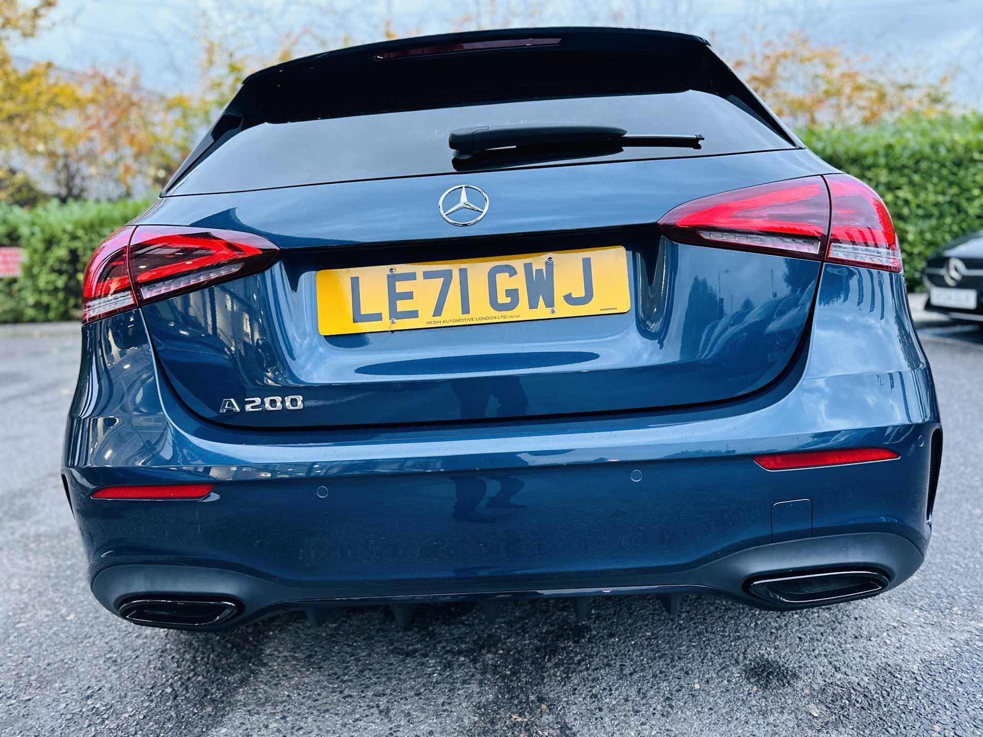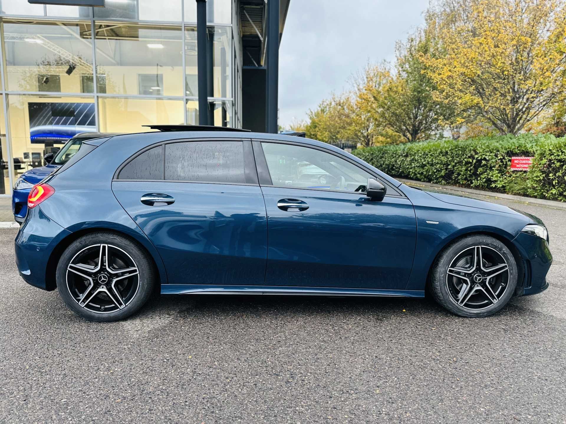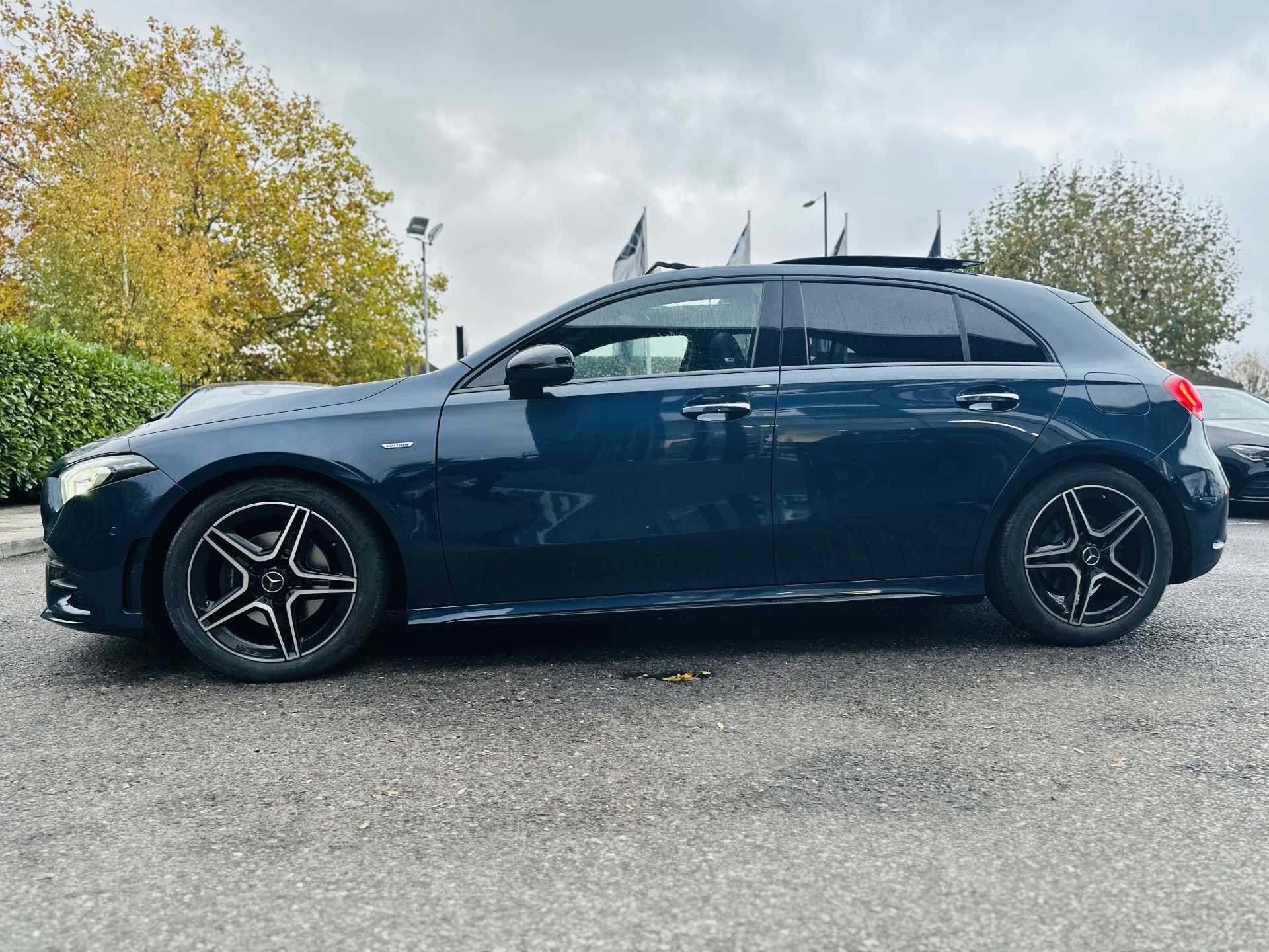 This is a 2022 Mercedes-Benz A-Class A200 AMG Line Premium Plus Edition 5dr Auto. The car comes in a sophisticated Denim Blue Metallic finish and has a 5-door hatchback design.