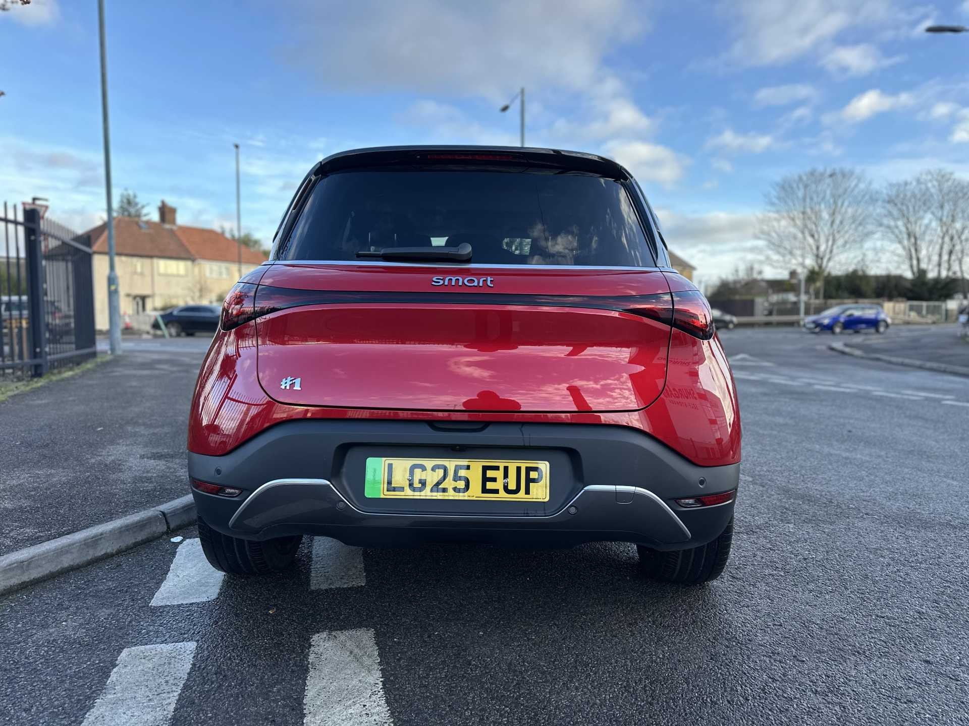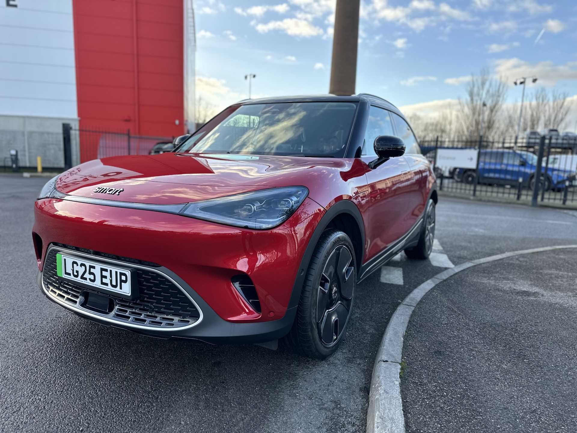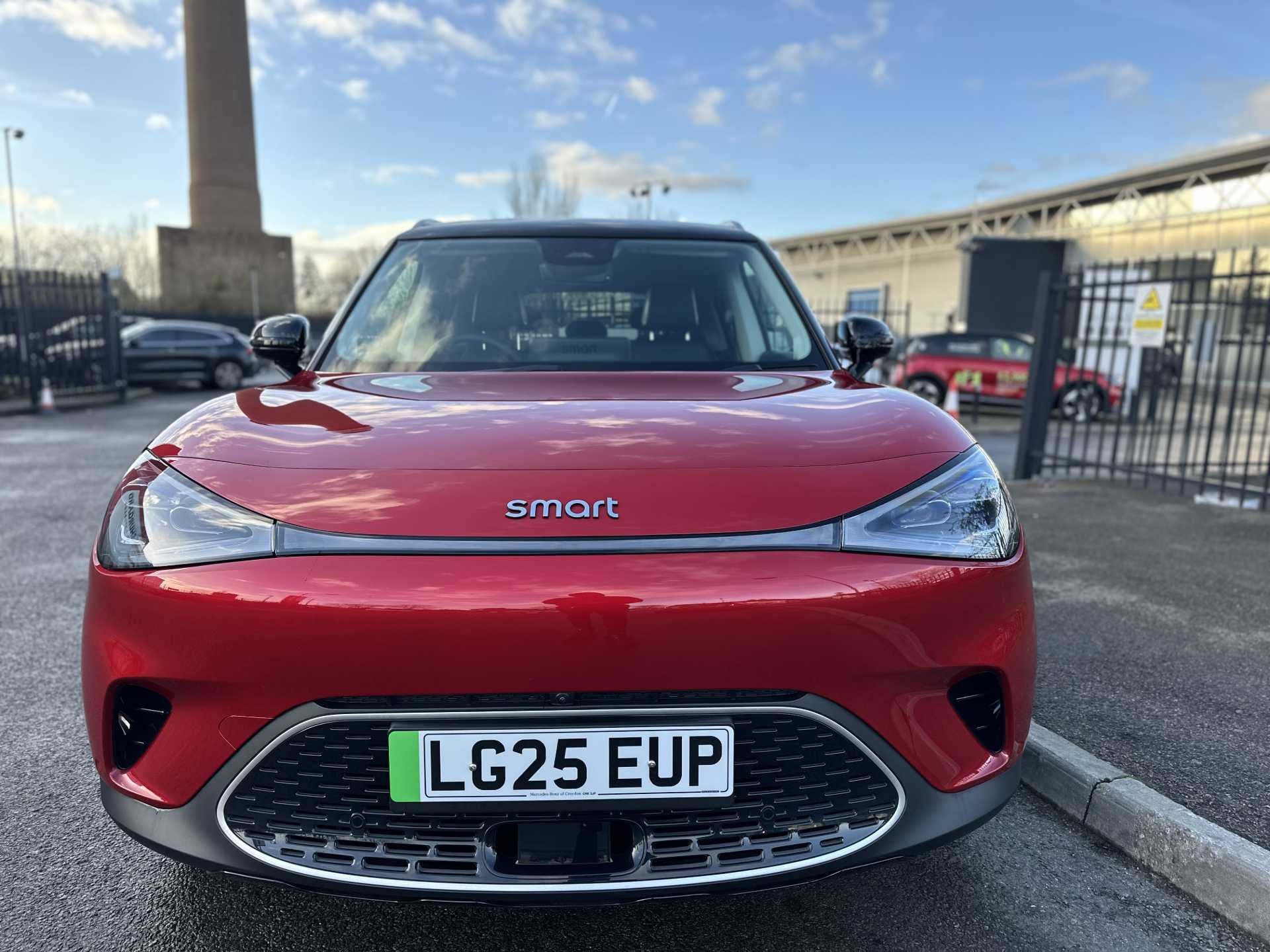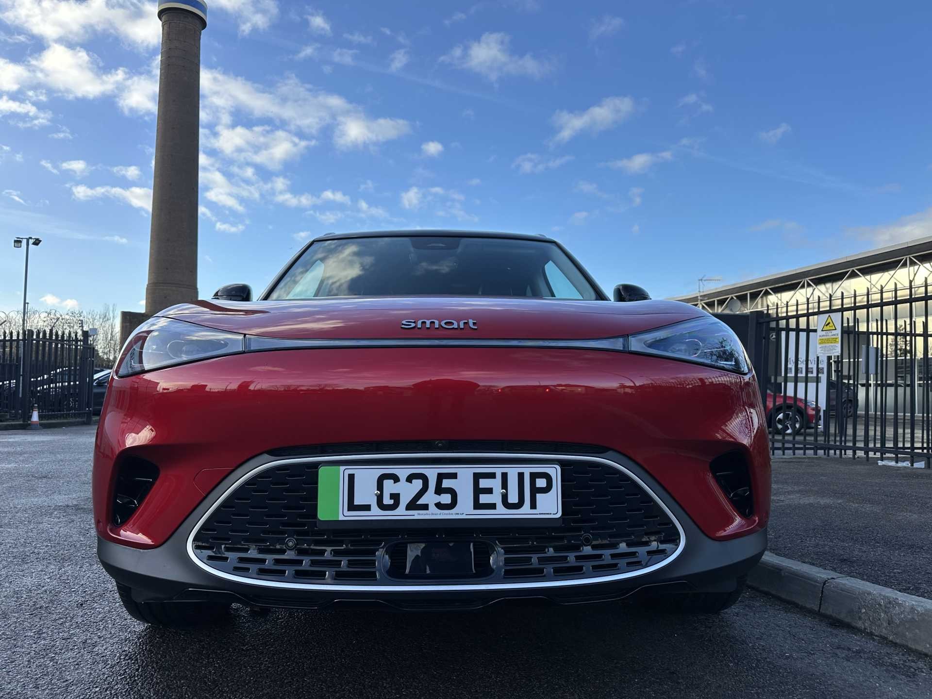 This is a 2025 Smart #1 Dark Matter, finished in red. It is an all-electric SUV with a 200 kW powertrain, automatic transmission and four-wheel drive, offering zero tailpipe emissions.