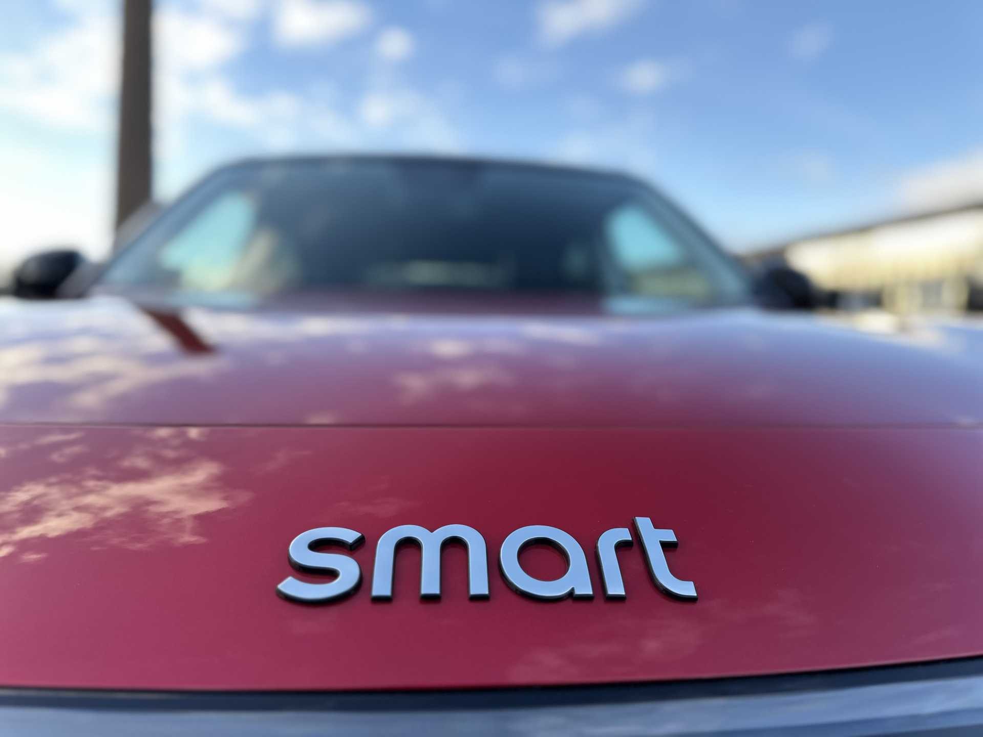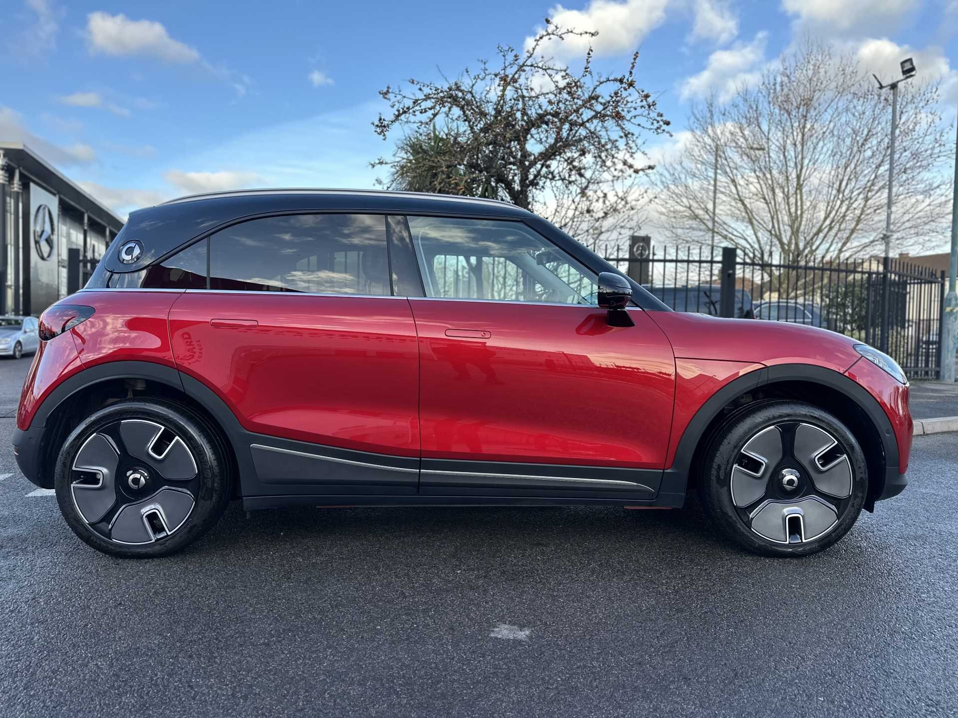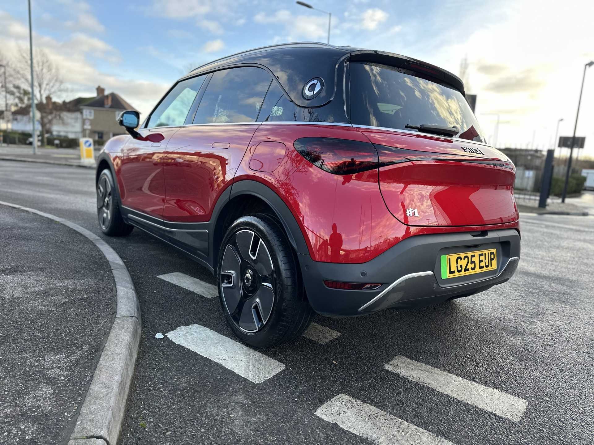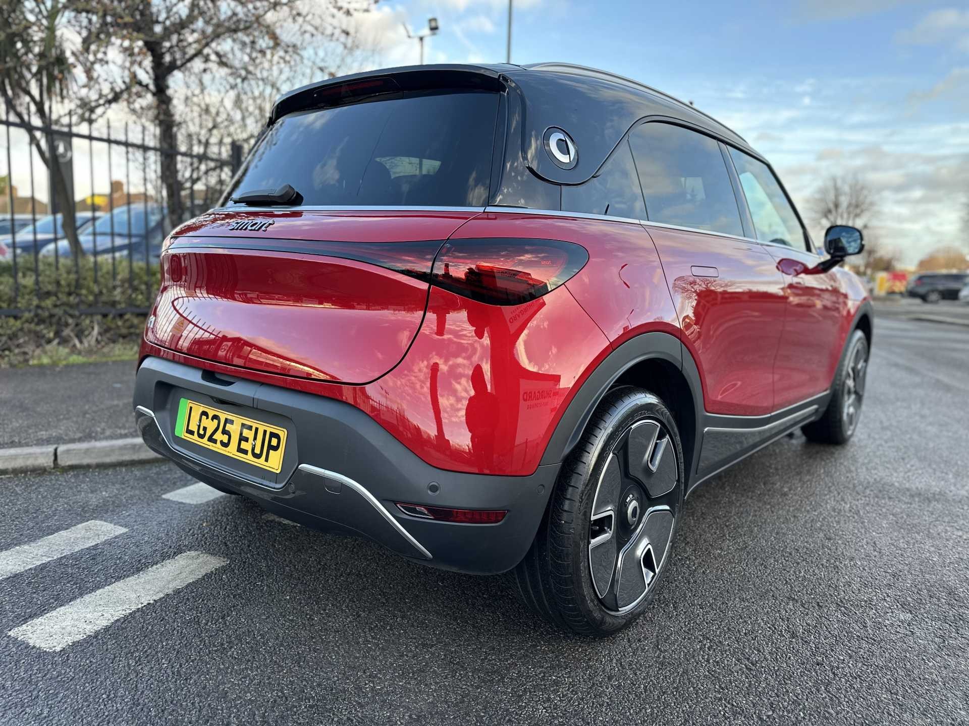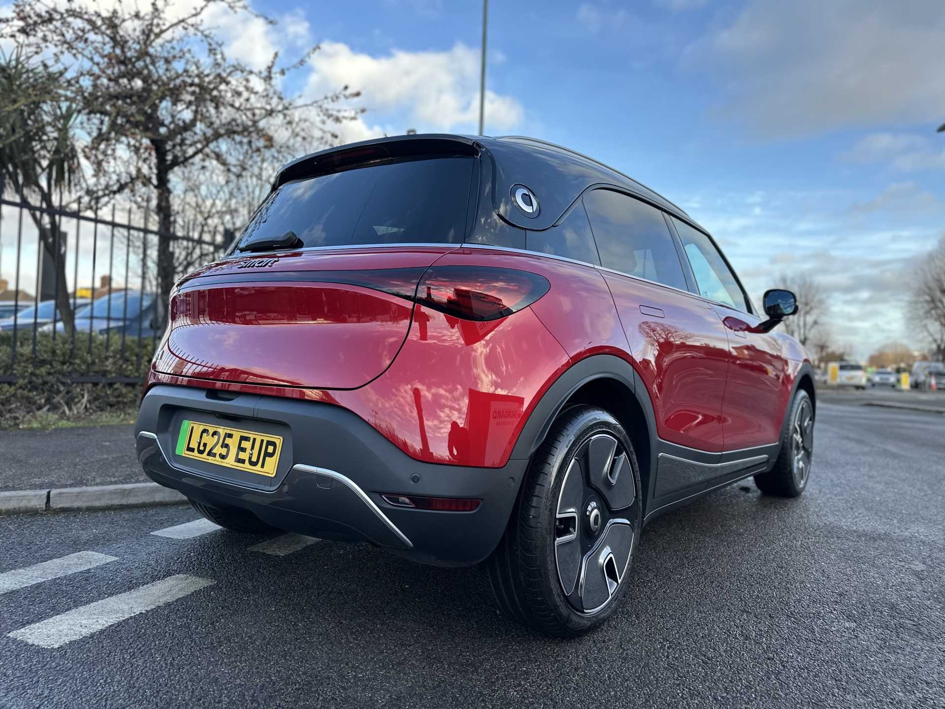 This is a 2025 Smart #1 Dark Matter, finished in red. It is an all-electric SUV with a 200 kW powertrain, automatic transmission and four-wheel drive, offering zero tailpipe emissions.