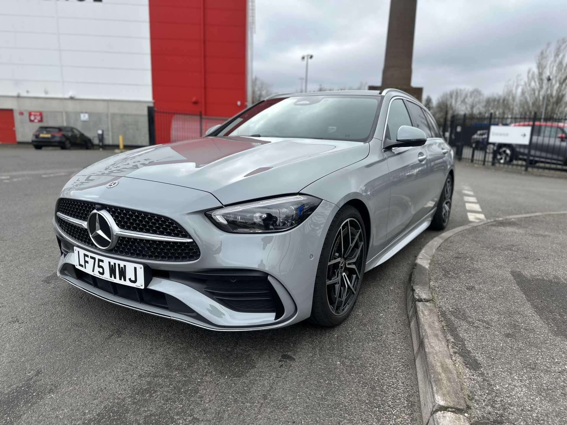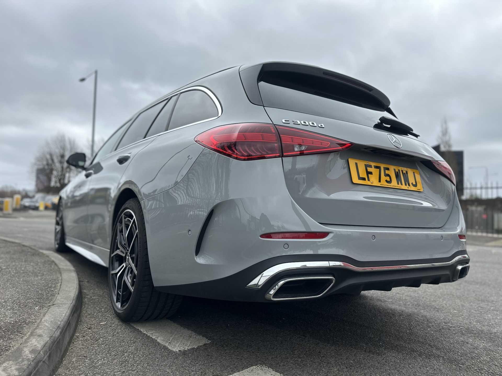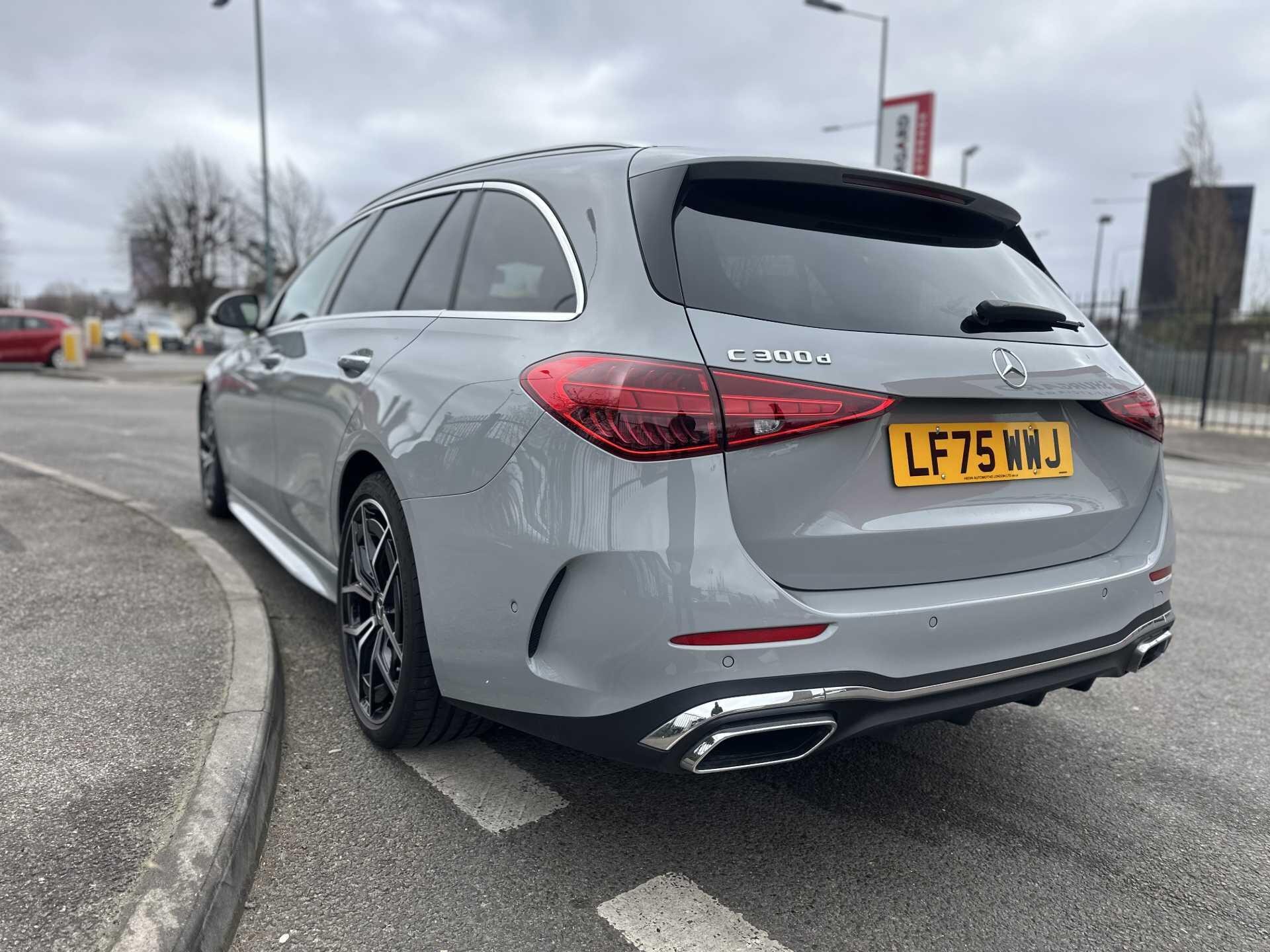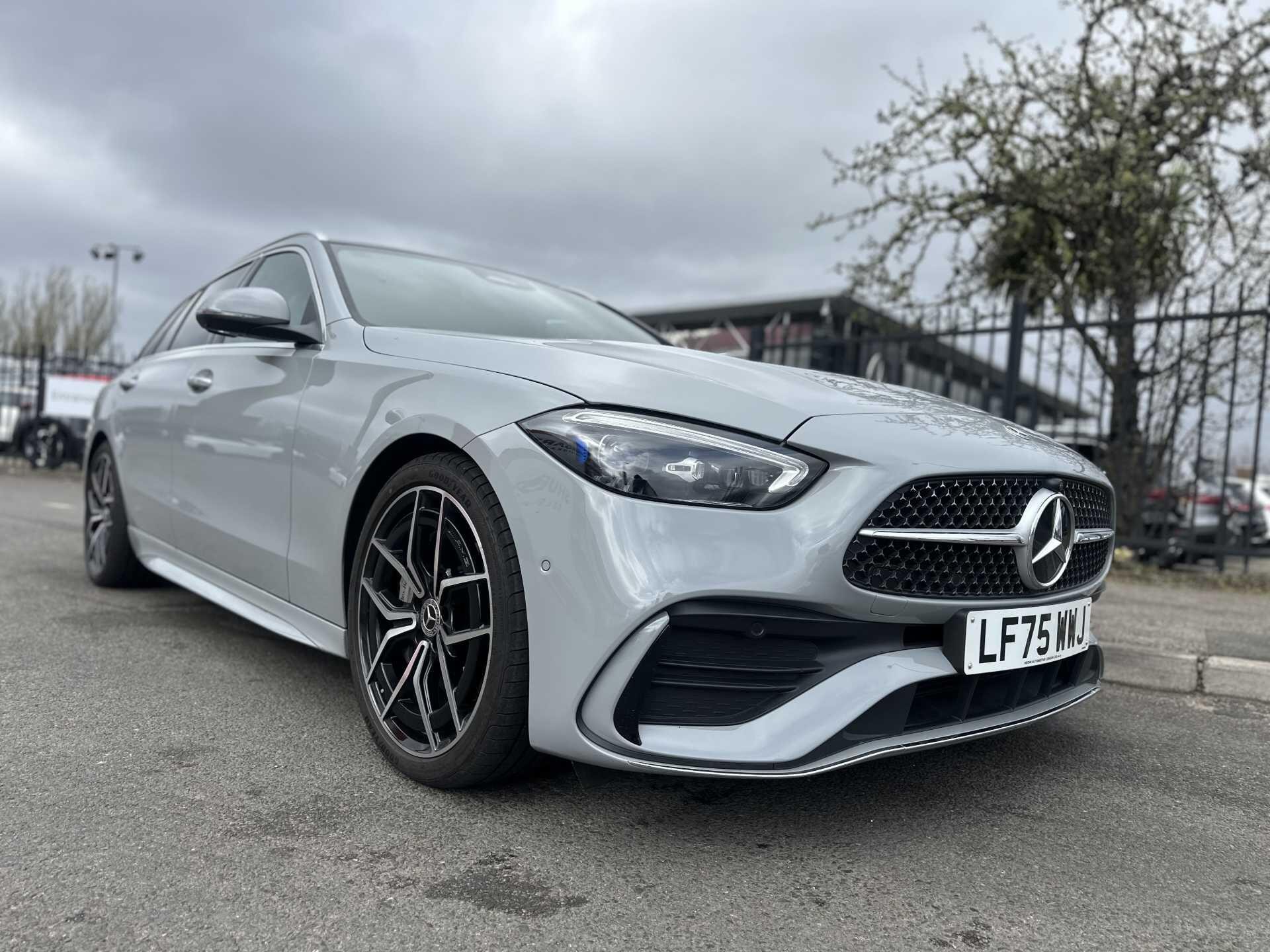 This is a 2025 Mercedes-Benz A-Class C300 d AMG Line Premium Estate in Alpine Grey, with automatic transmission and a diesel engine. It is a used vehicle with approximately 6,000 miles on the clock and has seating for five.