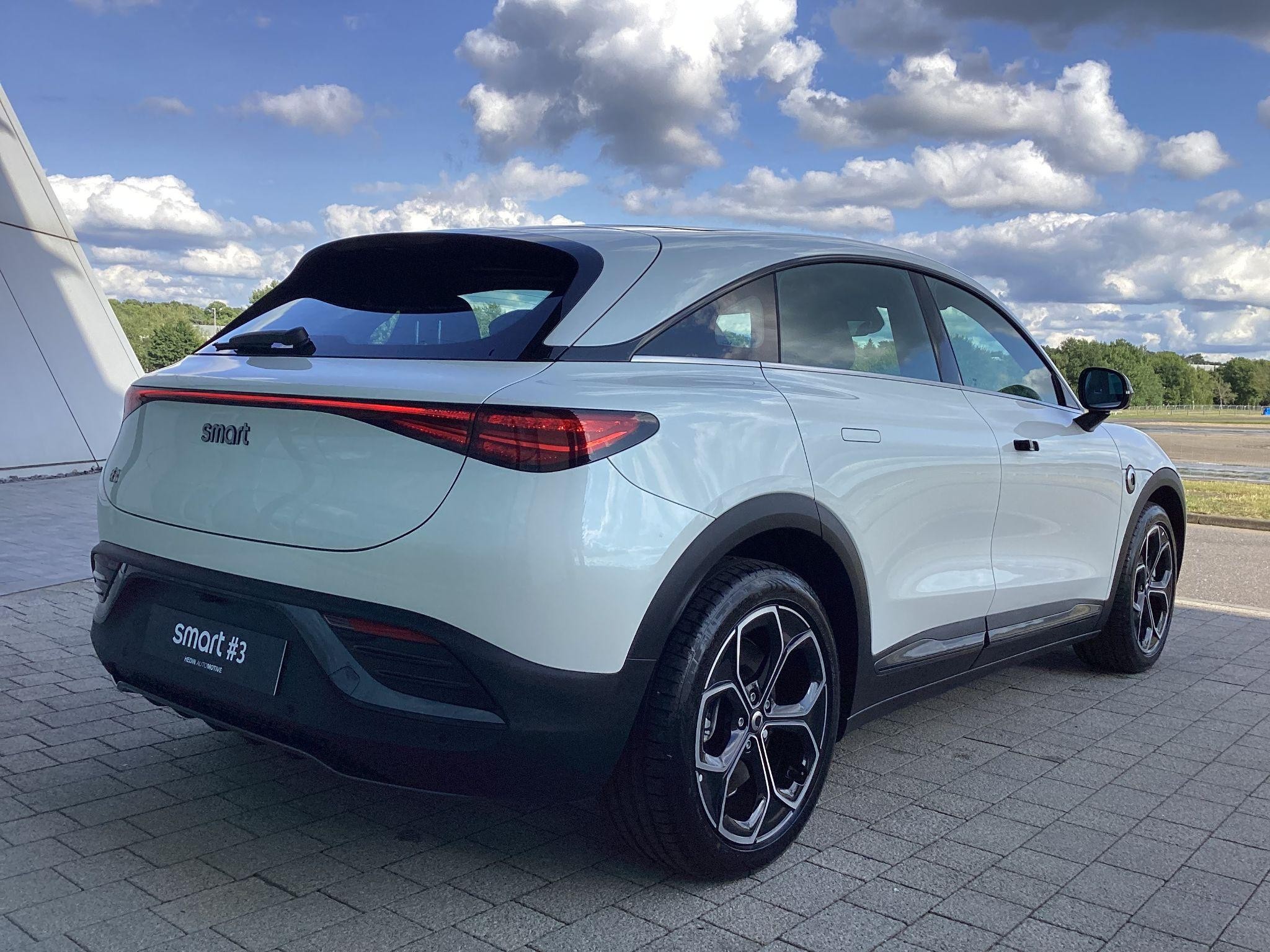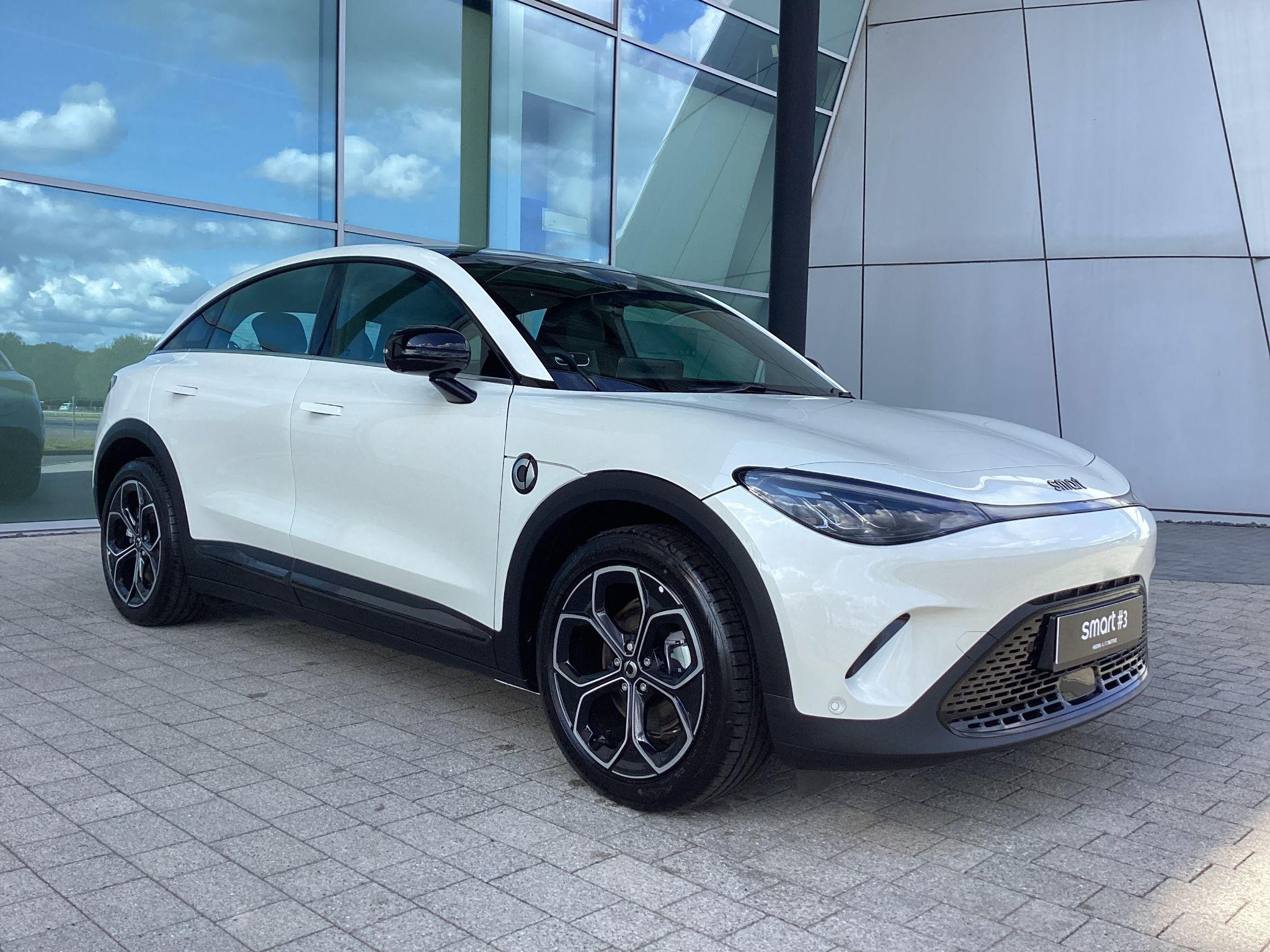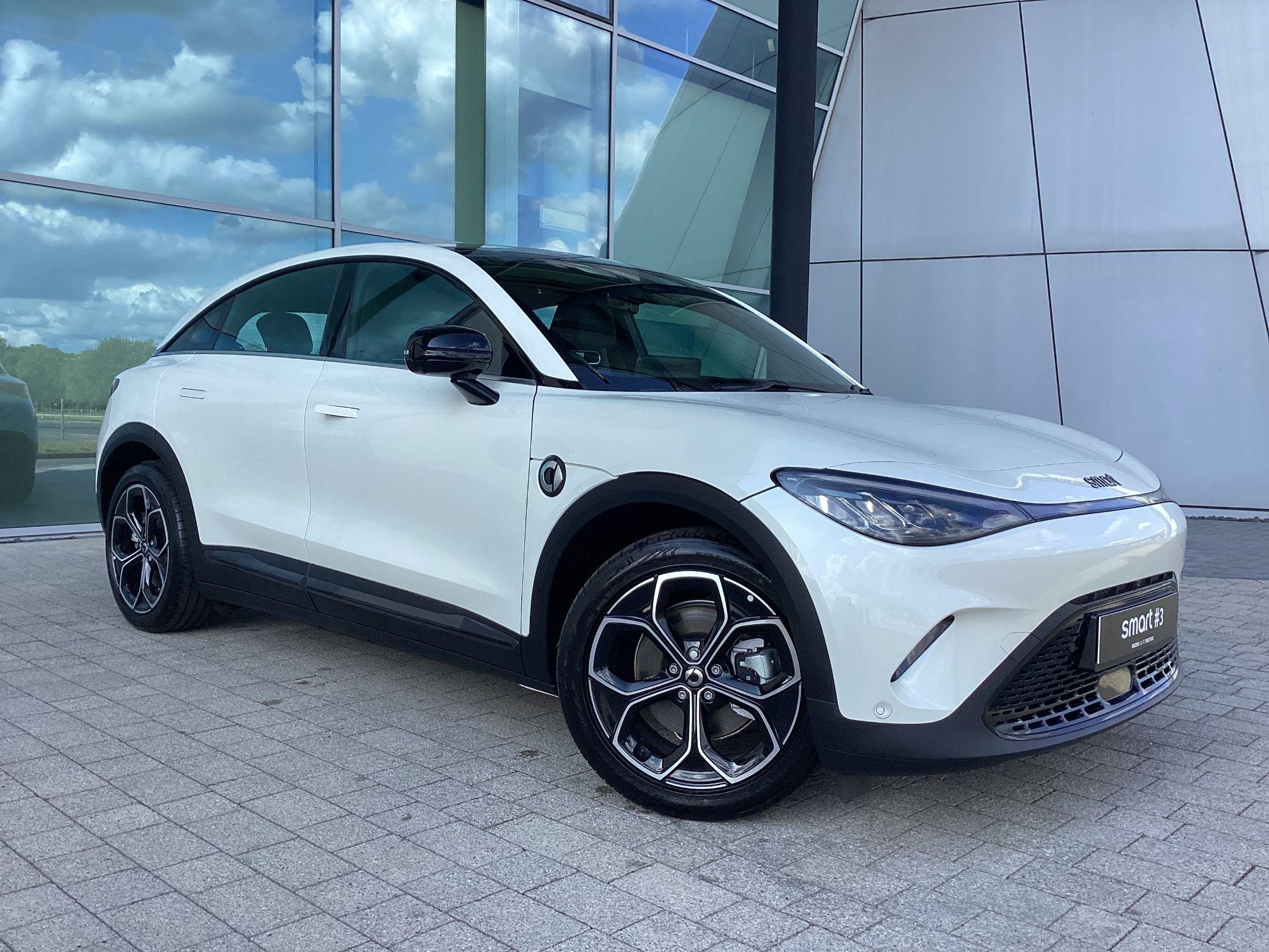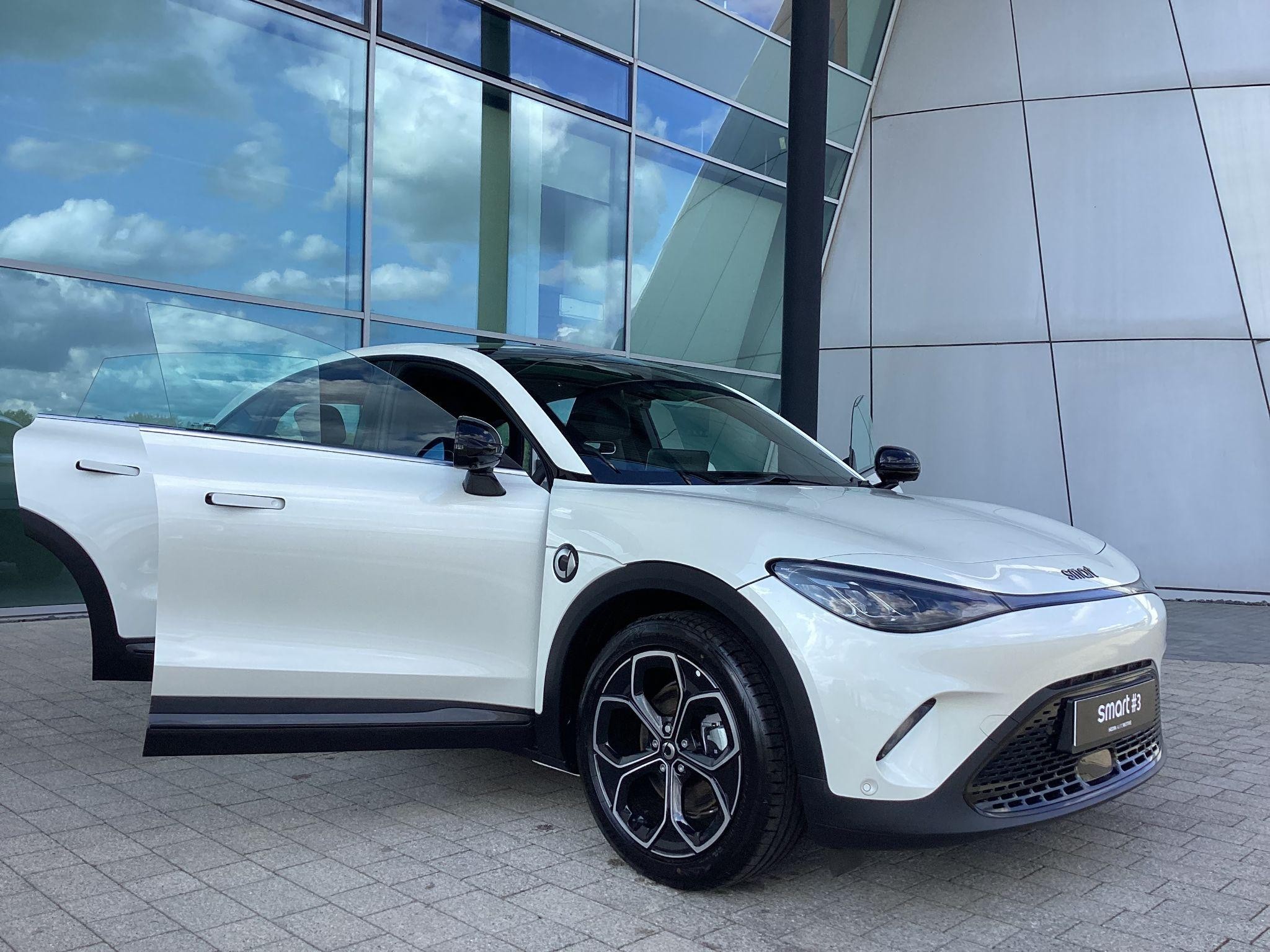 smart #3 Pro, 19" Alloy Wheels, Fixed Panoramic sunroof, 360° camera, Front/Rear parking sensors, Powered, heated front seats, Driver memory seat, Auto dimming, memory door mirrors, Powered tailgate, Blind Spot Assist, Adaptive Cruise Control, Apple CarPlay / Android Auto, Auto-Dimming Interior Mirror, Wireless Phone Charging, 12.8" central display touch screen. Battery size 49kWh and supplied with 8-Year / 100,000 mile warranty, DC charging 10 - 80% in 30 minutes and a published range of 202miles which in the real world would be around 165 on average depending on driving style.