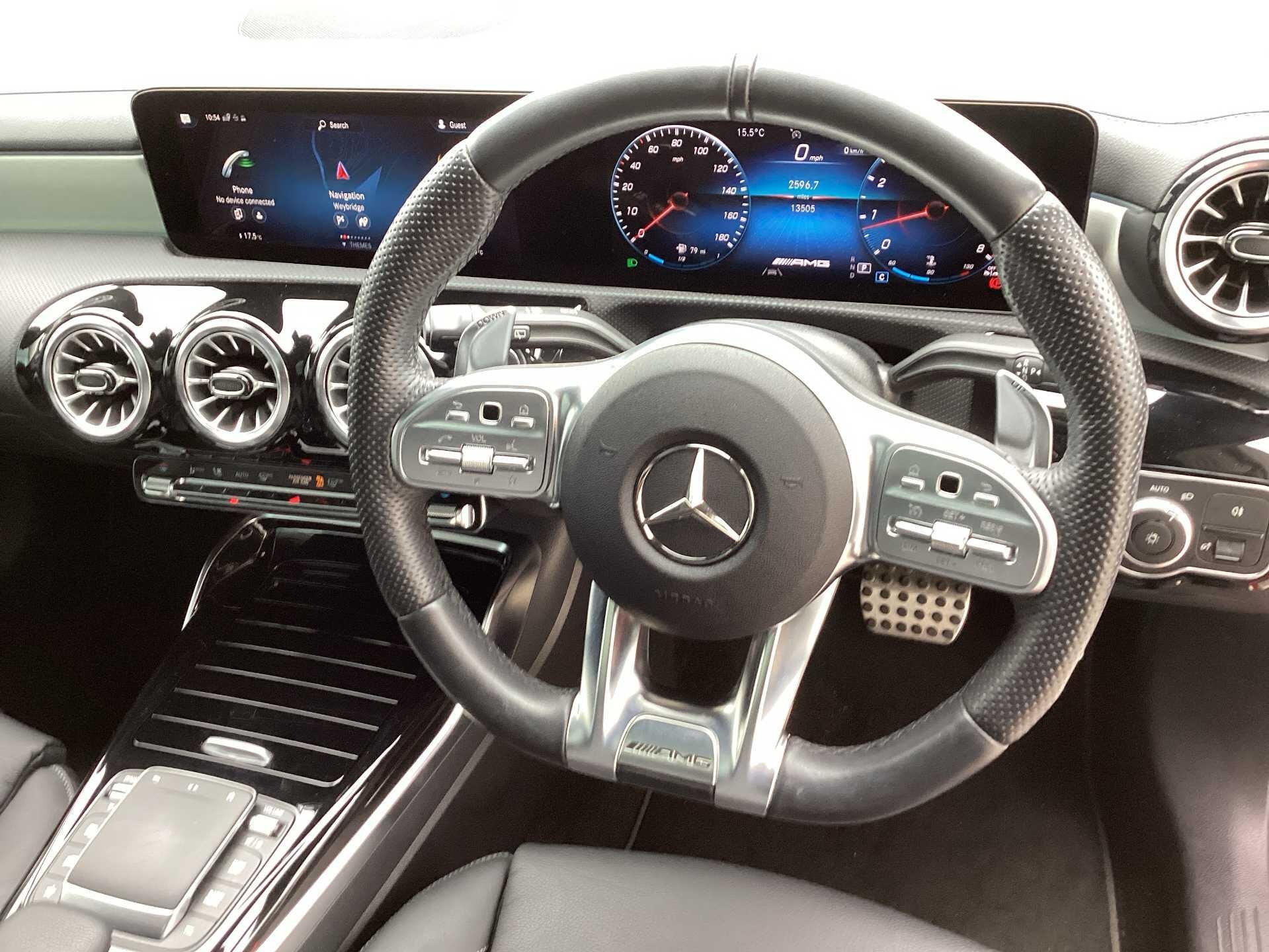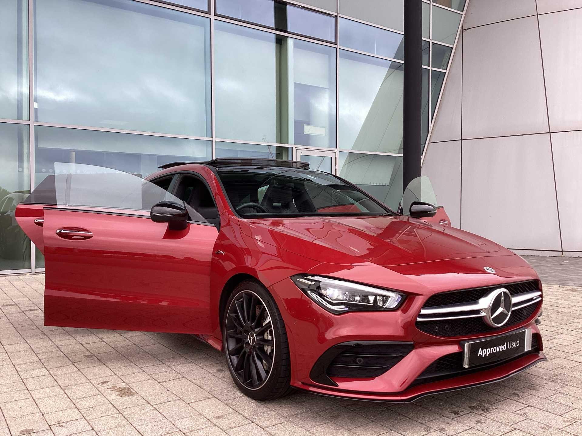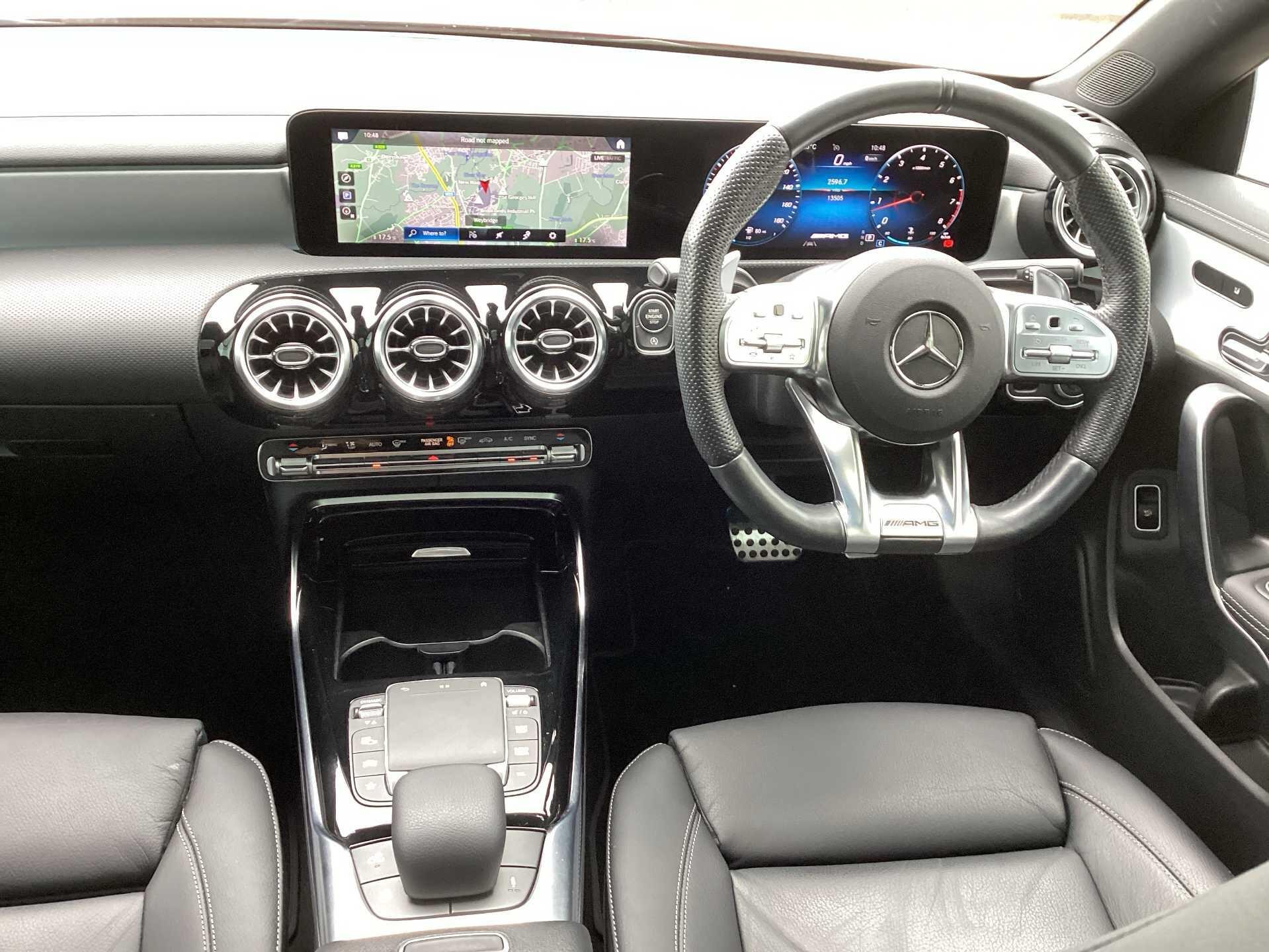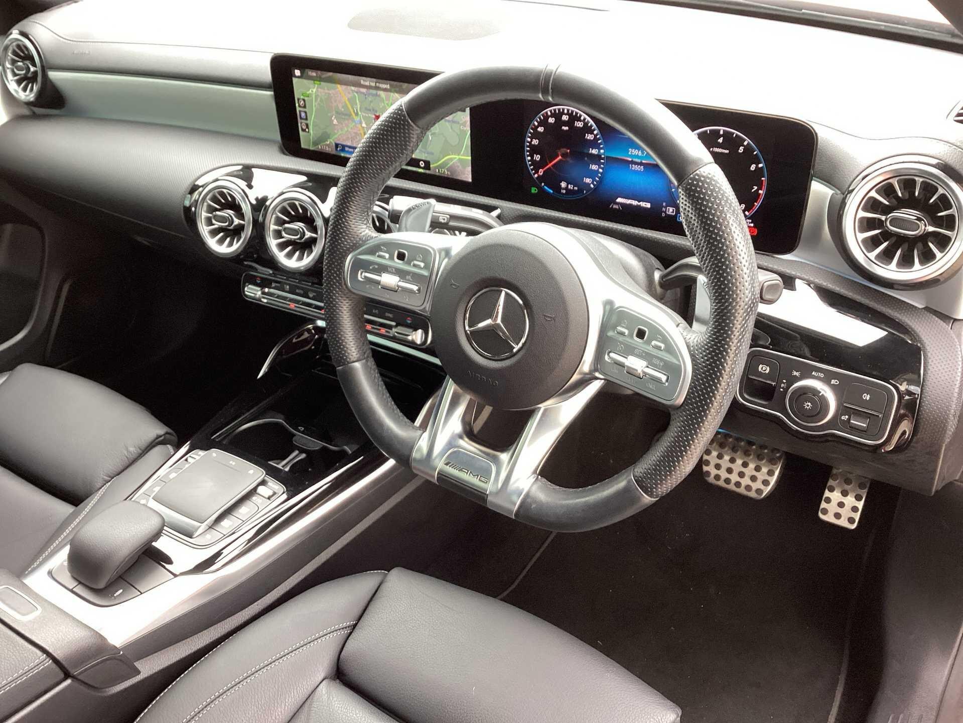 This 2023 Mercedes-Benz CLA35 AMG Premium Plus boasts an exceptionally low mileage of just 13505 miles, with its last service completed on 17th October 2025 at 13502 miles, and benefits from a manufacturer warranty valid for a further 24 months. This four wheel drive, Euro 6 compliant model is powered by a 2.0 litre petrol engine and features AMG trim. Its MOT is valid until October 2026, ensuring peace of mind. Notable features include dual Bluetooth interfaces, a comprehensive parking package with front and rear sensors and a rear camera, and seamless smartphone integration with both Apple CarPlay and Android Auto. The convenience of automatic headlamp activation is also included, alongside a panoramic sunroof that can be opened.