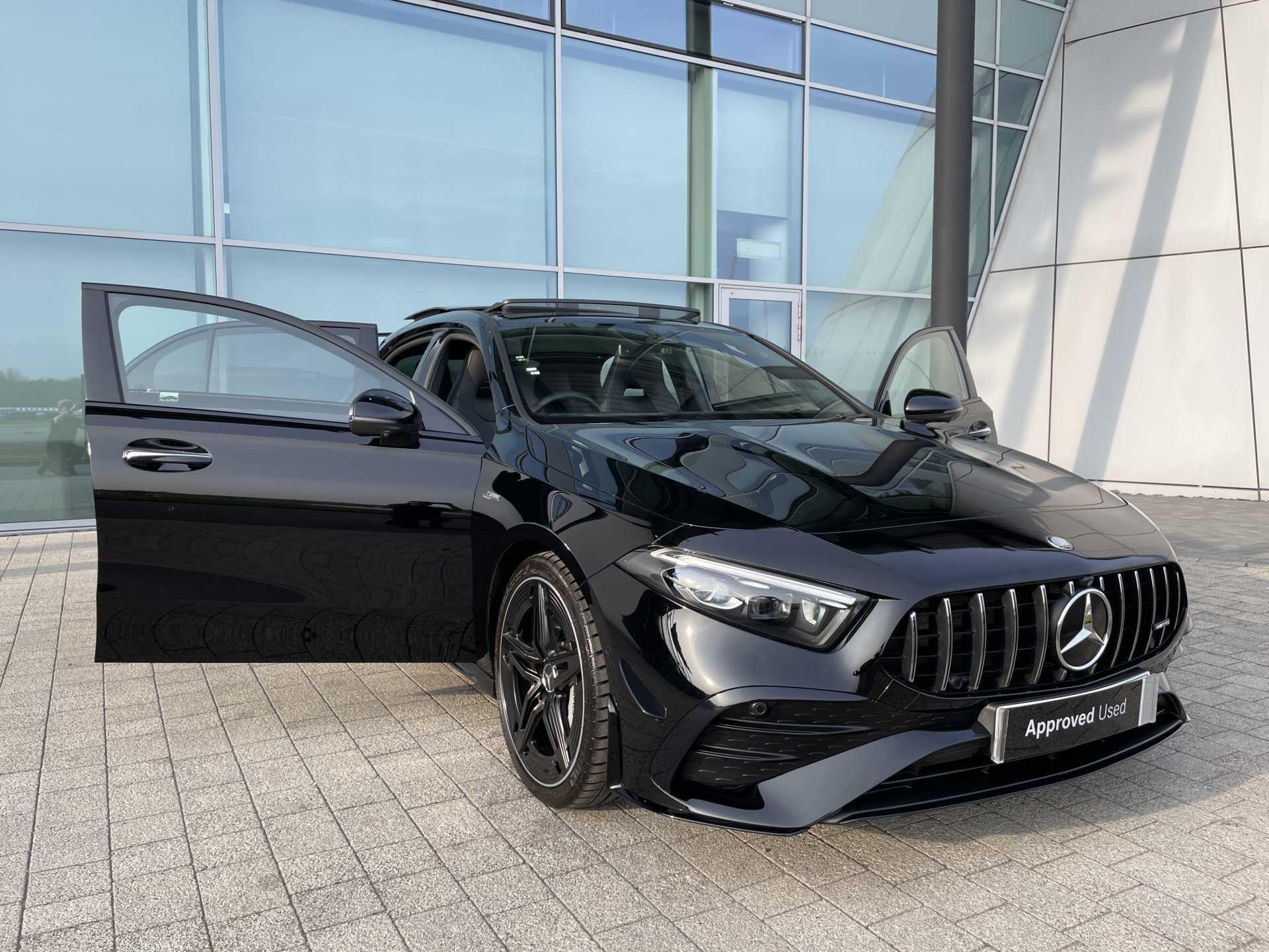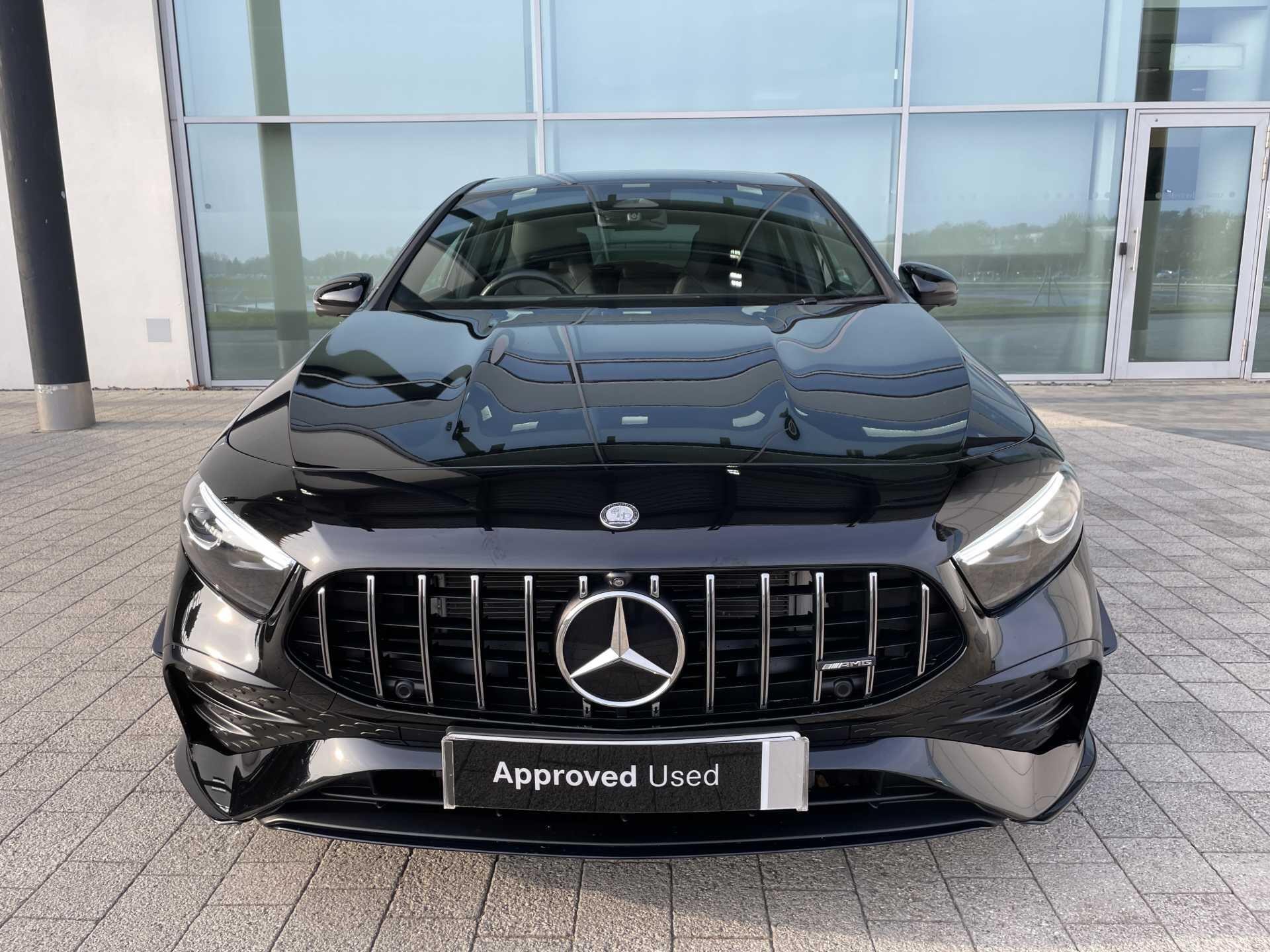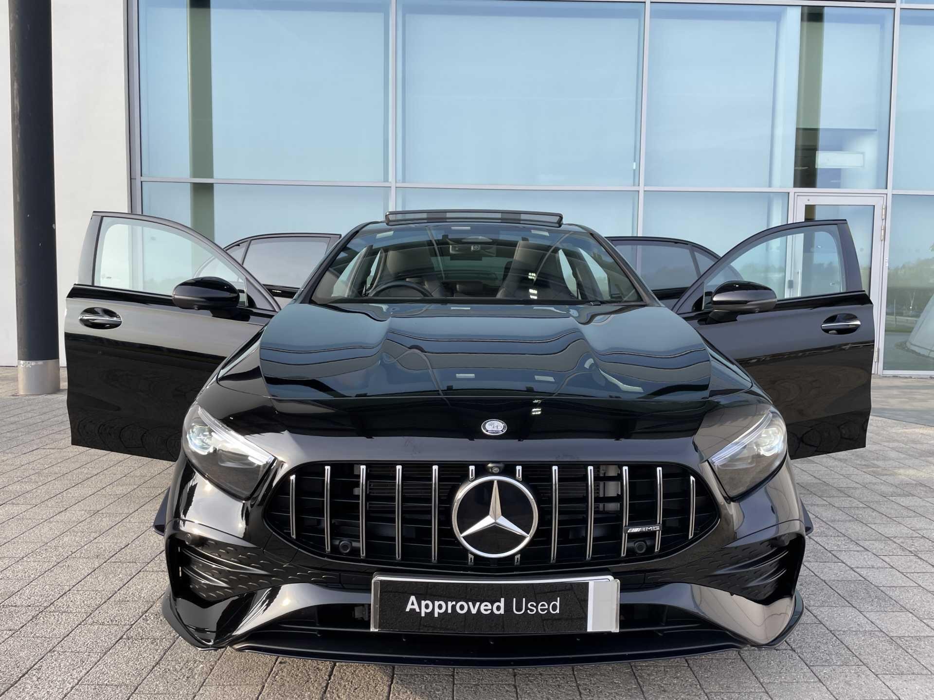 This 2023 Mercedes-Benz A35h AMG (Premium Plus) boasts exceptionally low mileage for its age, having covered just 9806 miles, and benefits from a recent service completed on 2026-03-26 at 9810 miles. This Euro 6 compliant, four wheel drive model features a powerful 2.0L Petrol Hybrid engine and comes with a 12 month warranty, being a Mercedes-Benz manufacturer approved vehicle. Notable features include advanced MULTIBEAM LED Headlamps with Adaptive Highbeam Assist, a Head Up Display for convenient information access, Blind Spot Assist for enhanced safety, Wireless Charging for your devices, and a spacious Panoramic Glass Sunroof.