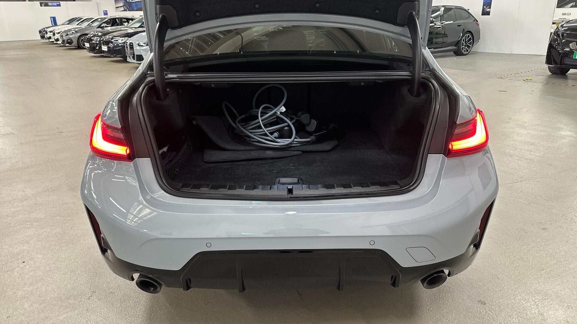 This 2024 BMW 330e M Sport presents a remarkable opportunity with its exceptionally low mileage of just 17,656 miles, complemented by a full service history. This Four Wheel Drive model features a 2.0 litre petrol plug in hybrid engine, adhering to Euro 6 emissions standards. The M Sport trim enhances its appeal, and notable features include an electric glass sunroof, front lumbar support for added comfort, and a Visibility Pack with LED headlights. For effortless manoeuvring, it is equipped with a Parking Assistant that incorporates front and rear sensors, along with a rear camera.