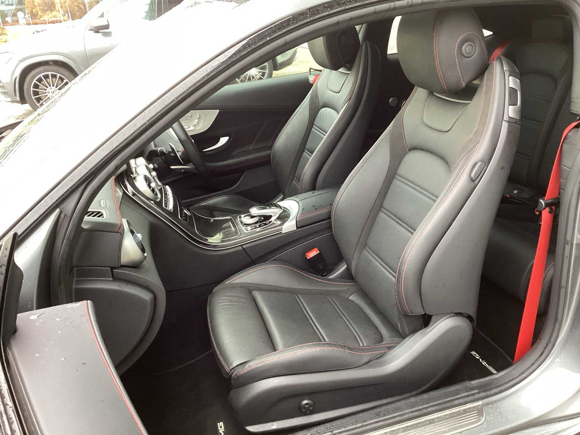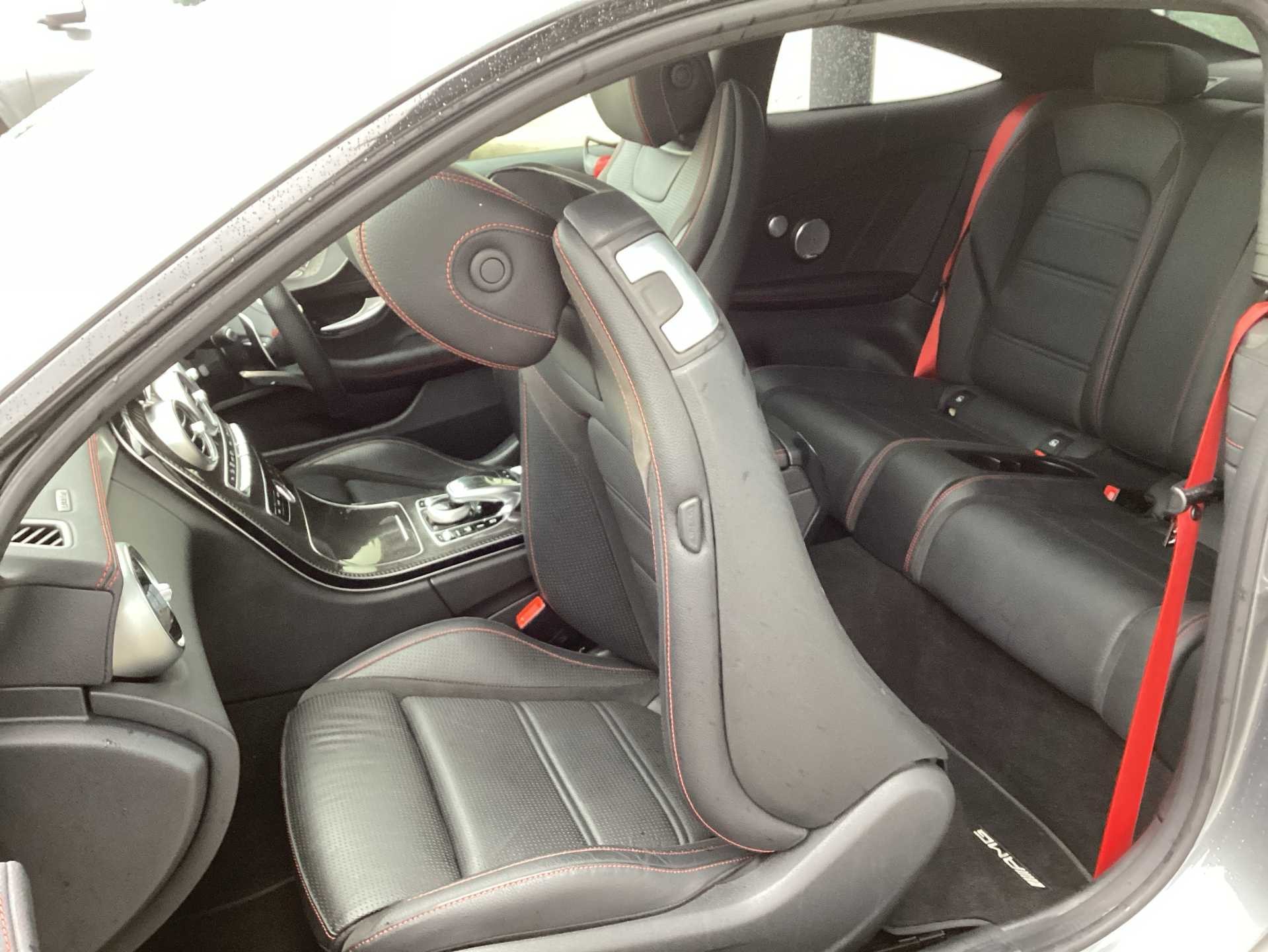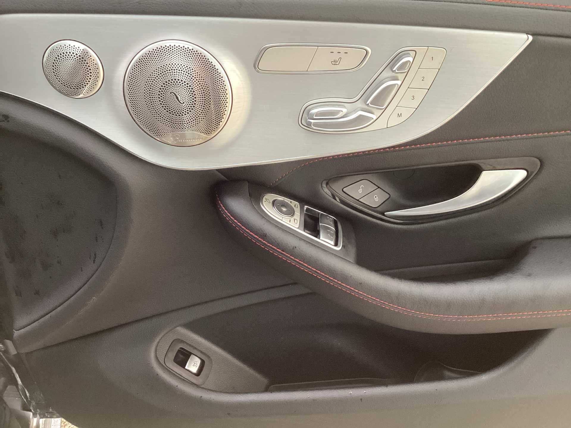 - 3 spoke AMG performance flat bottom leather steering wheel in black, heavily embossed central grip area silver chrome and contrast topstitching in red