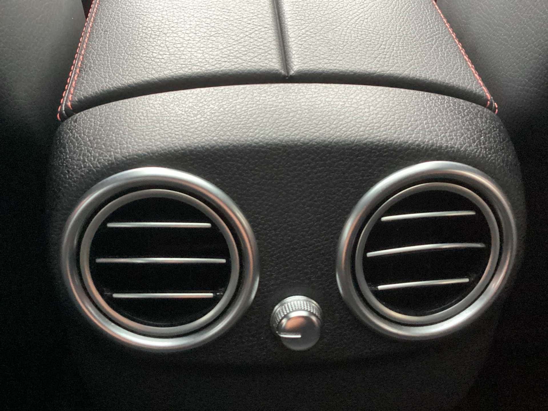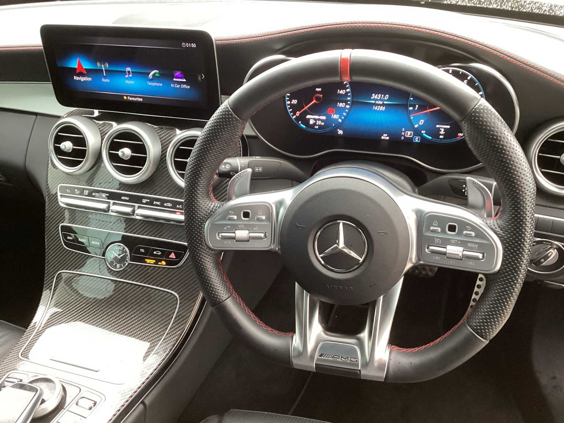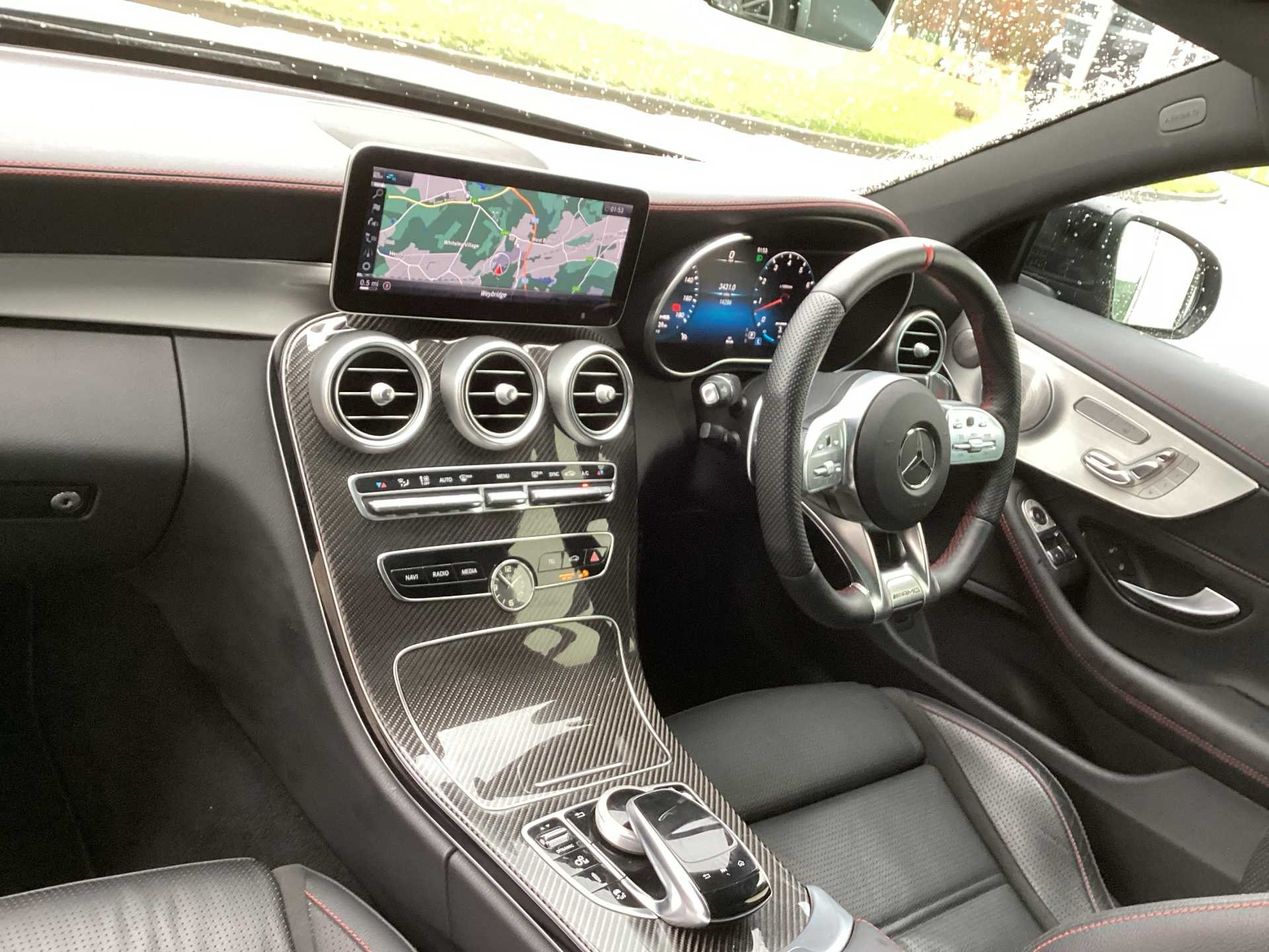 - 3 spoke AMG performance flat bottom leather steering wheel in black, heavily embossed central grip area silver chrome and contrast topstitching in red